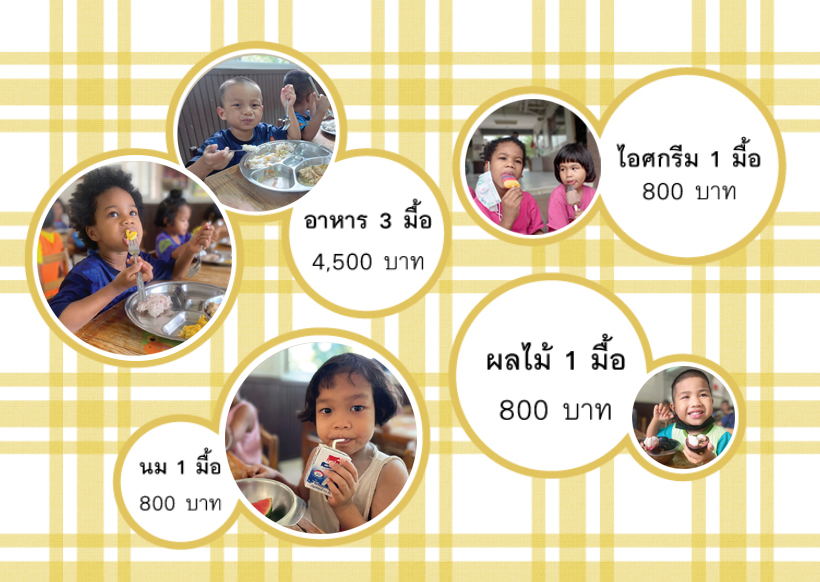 รายการเลี้ยงอาหารโครงการโรงเรียนอนุบาลหมู่บ้านเด็ก สานรัก (เด็กอายุ 3 ขวบครึ่ง - 6 ขวบครึ่ง) สถานที่ พุทธมณฑล สาย 4 จํานวนเด็ก 60 คน