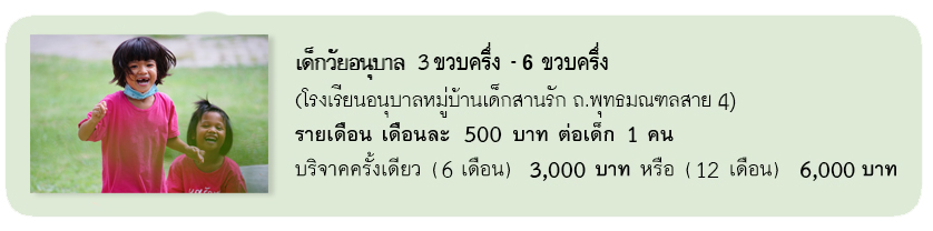 หากท่านมีความประสงค์จองเลี้ยงอาหารเด็ก ติดต่อ โรงเรียนอนุบาลหมู่บ้านเด็ก สานรัก