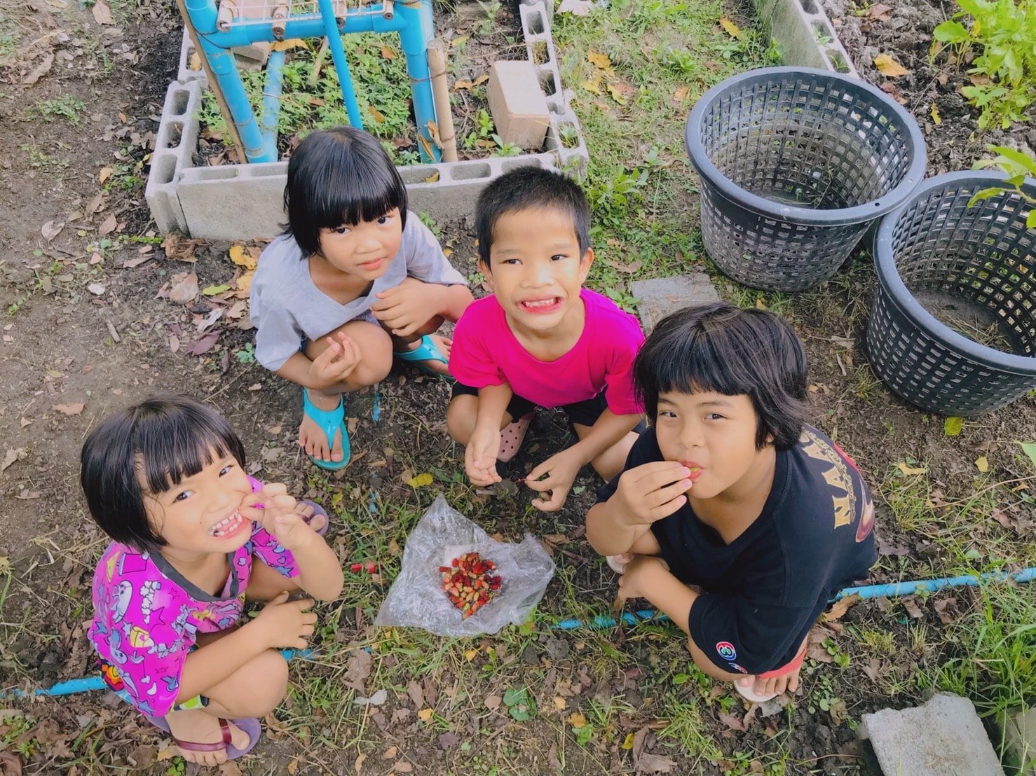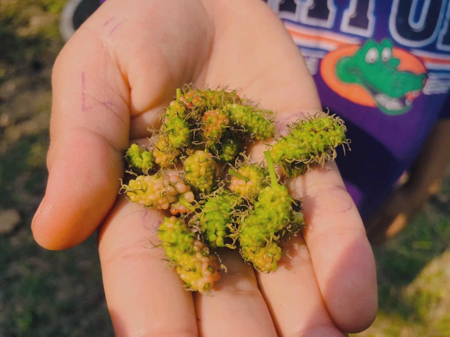 ระหว่างนั้นเด็กๆ ช่วยกันเก็บลูกหม่อนอย่างสงสัย จะมีรสชาติยังไง จะเปรี้ยวหรือจะหวาน พอเก็บเสร็จนำลูกหม่อนมาล้างน้ำให้สะอาด มาพิสูจน์รสชาติกัน “ลูกแดงๆ เปรี้ยวๆ ลูกสีม่วงดำหวานๆ หืม อร่อยจังเลย” เด็กๆและแม่ครูล้อมวงกินอย่างมีความสุข ความสุขแบบนี้หาได้ง่ายกับสิ่งรอบๆ ตัว