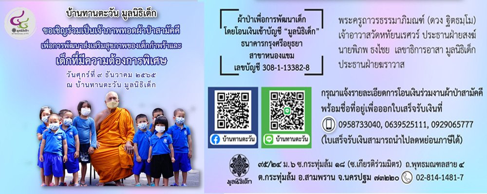 โดยท่านสามารถเป็นส่วนหนึ่ง ในการทำบุญผ้าป่าโครงบ้านทานตะวัน มูลนิธิเด็ก ได้ที่ บัญชีออมทรัพย์ ชื่อบัญชี : มูลนิธิเด็ก