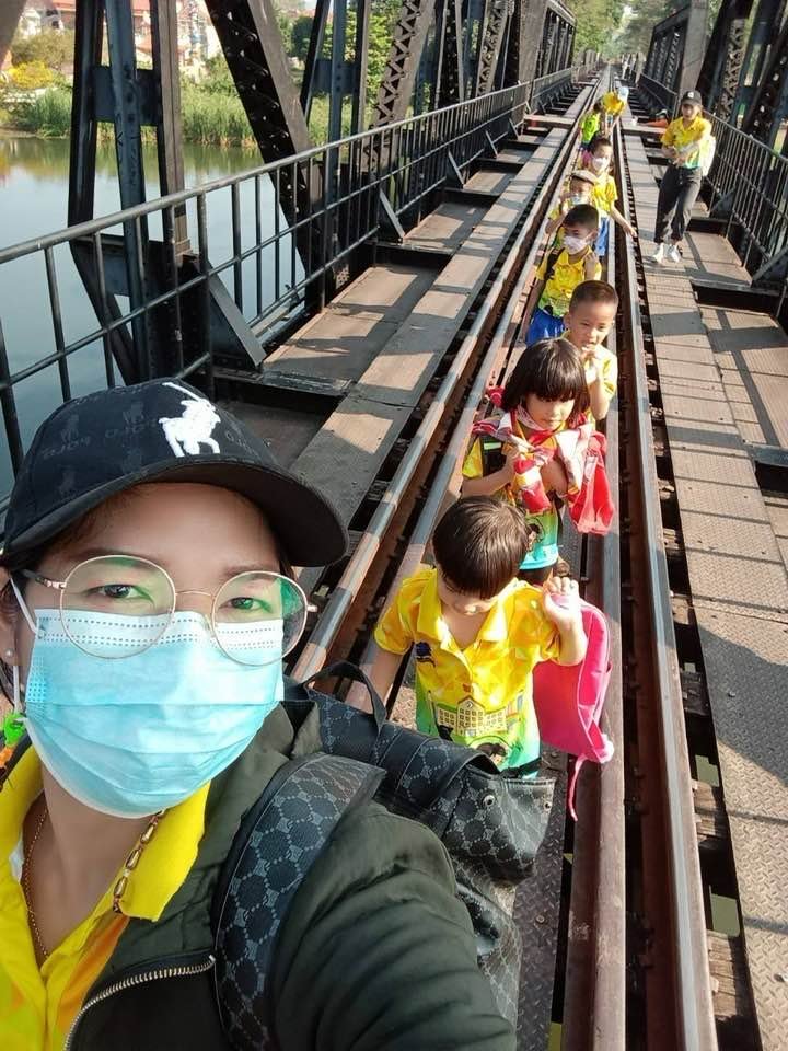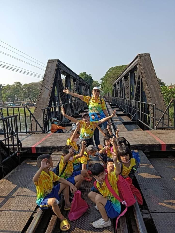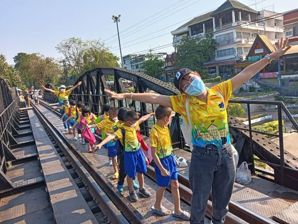 เด็กๆออกเดินทางจากโรงเรียนไปถึงสะพานข้ามแม่น้ำแคว