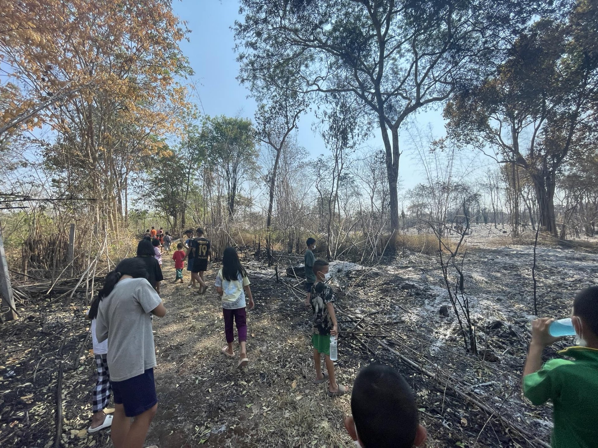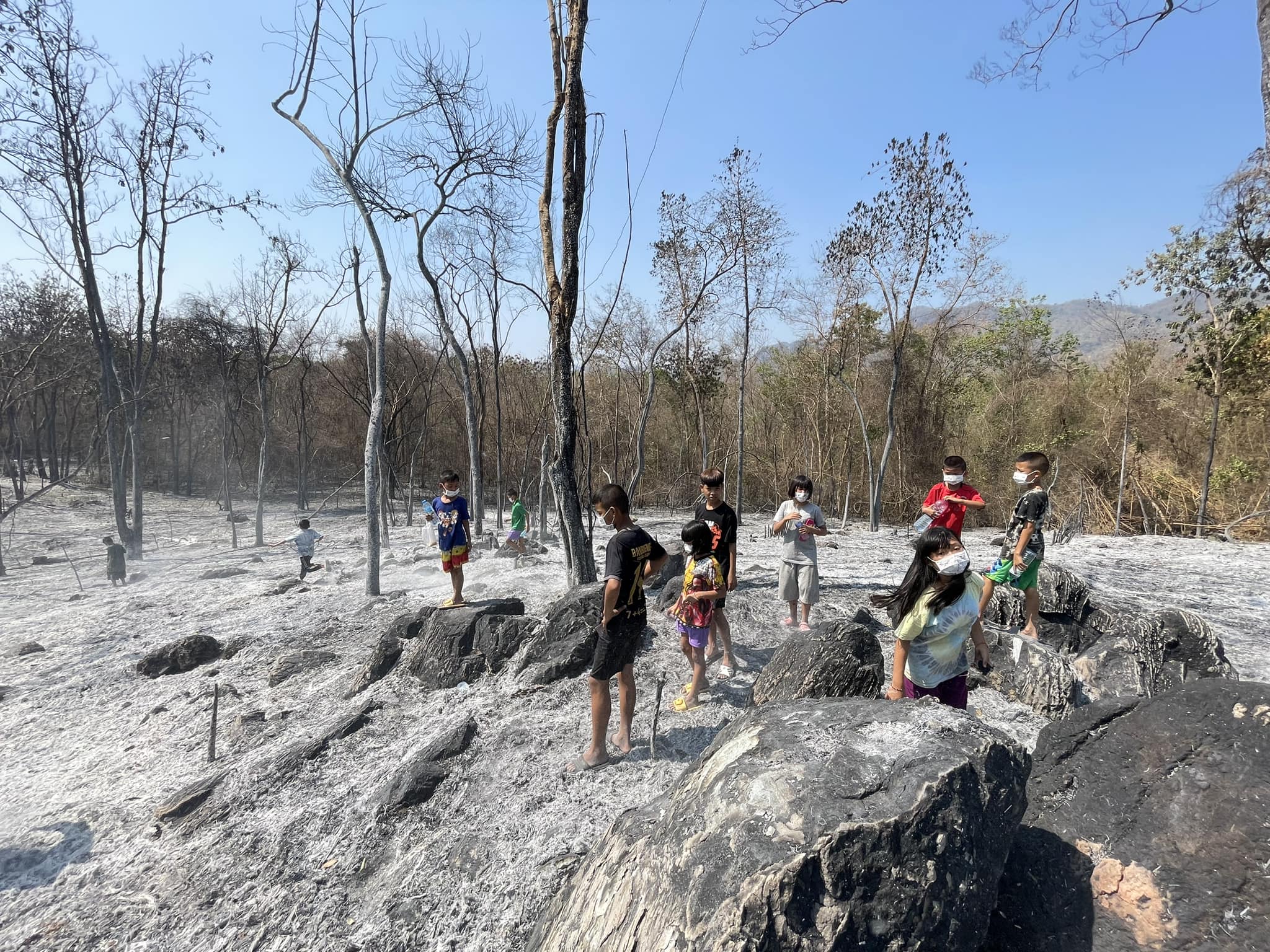 บริเวณรอบๆ ป่าใกล้บริเวณ โรงเรียนหลังจากไฟป่าได้ดับสนิทและมีความปลอดภัยแล้ว