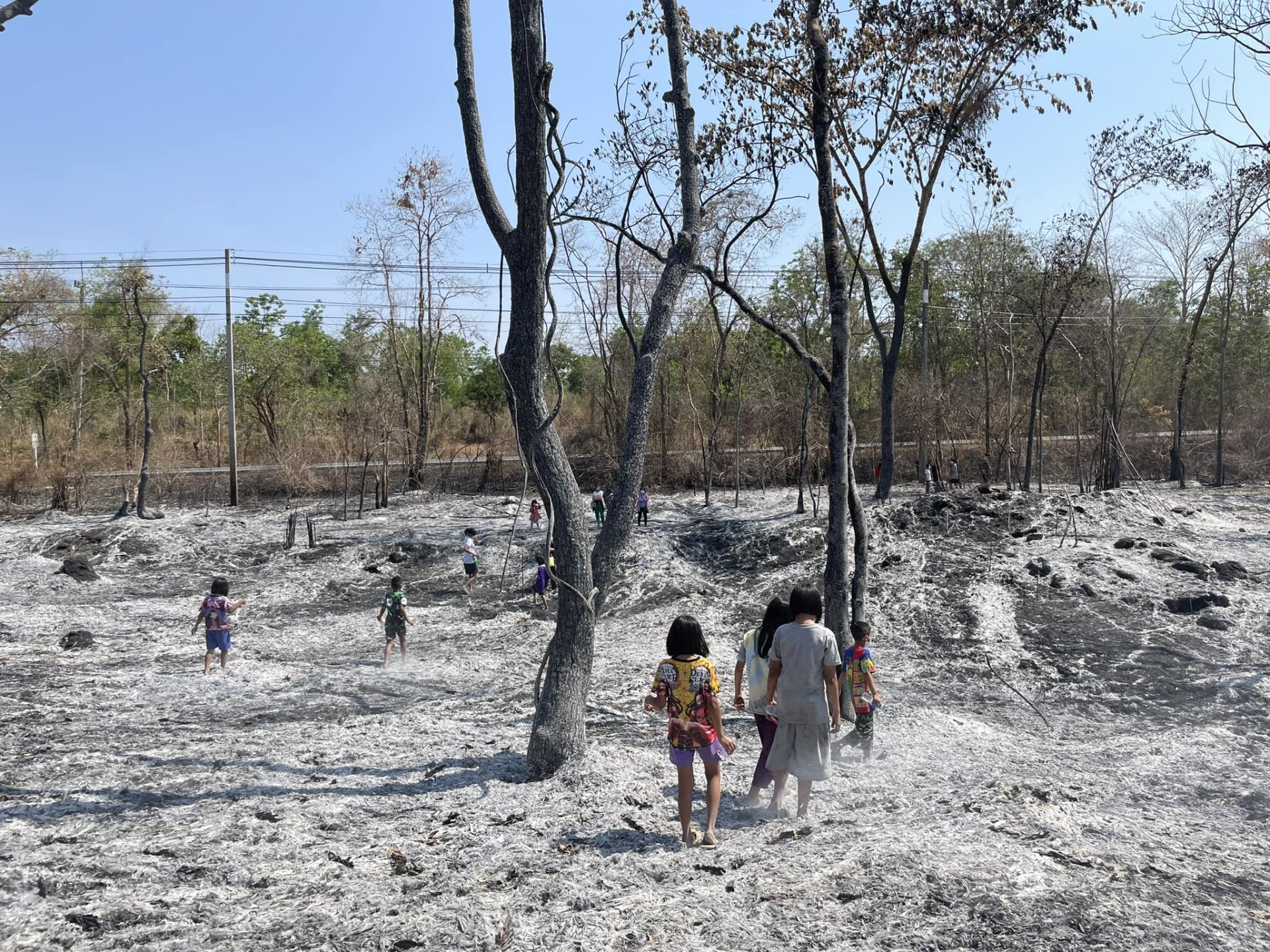 เด็กๆ เข้าสำรวจหลังไฟไฟม้ป่าบริเวณโรงเรียน
