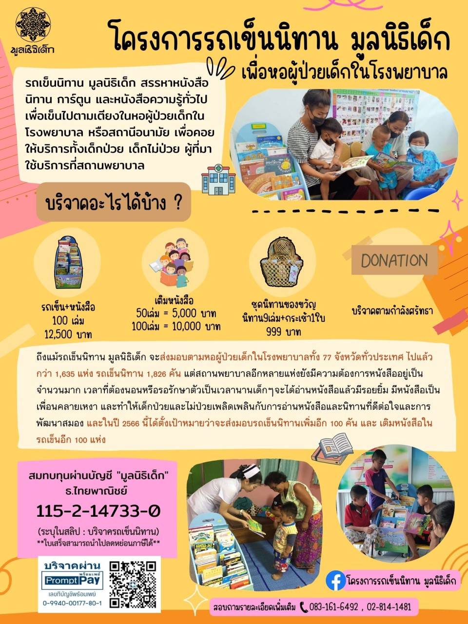 ร่วมเป็นส่วนหนึ่งในการสนับสนุนโครงการรถเข็นนิทานได้ที่บัญชี “มูลนิธิเด็ก”