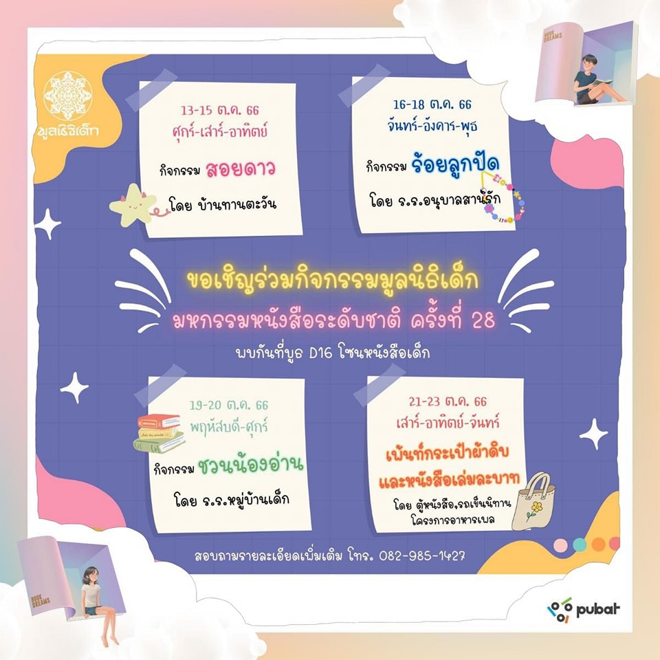 พรุ่งนี้งานมหกรรมหนังสือระดับชาติครั้งที่ 28 เริ่มต้นแล้ว 12-23 ตุลาคม 2566 @ศูนย์ประชุมแห่งชาติสิริกิติ์ ฮอล์ 5-7 ชั้น LG บูธ D 16 ทั้งนี้ทางมูลนิธิเด็กมีเวทีจัดเสวนา 2 วัน วันจันทร์ที่ 16 และวันอังคารที่ 17 เวลา เวลา 15.00-16.00 น. เวลาเดิมทั้ง 2 วัน รวมไปถึงมีโครงการที่เข้าร่วมประชาสัมพันธ์ทั้งหมด 6 โครงการ ซึ่งมีกิจกรรมให้เด็กๆ น้องๆ ได้ร่วมสนุก สุดหรรษา ในแต่ละวัน ดังนี้