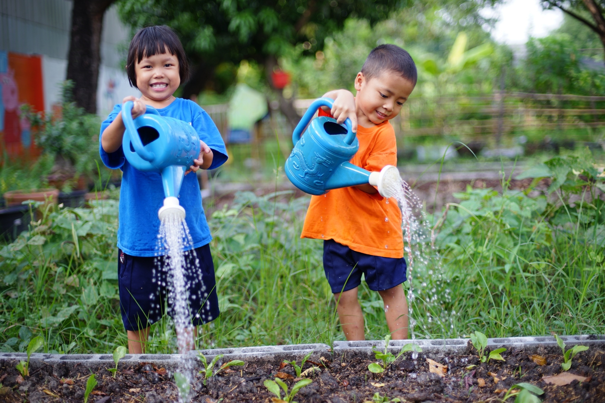 หนูปลูกเองได้ : ภาพน้องๆ ปลูกผัก รดน้ำแปลงผักที่โรงเรียนอนุบาลหมู่บ้านเด็กสานรัก มูลนิธิเด็ก