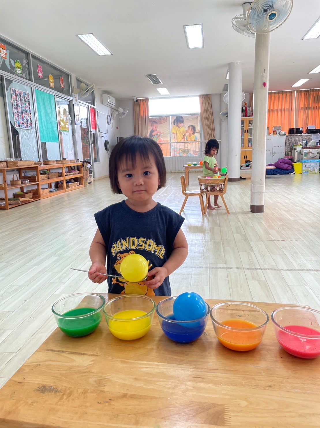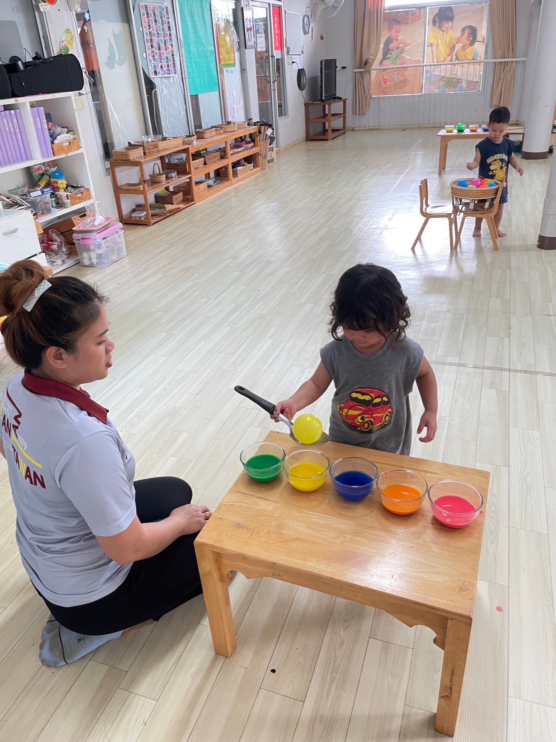 เช้านี้ พี่บี และ แม่หญิงได้พาเด็กเดินรอบบ้านทานตะวัน เพื่อเตรียมความพร้อมก่อนเข้าห้องเรียนรู้ พี่บีพาเด็กๆ เดินดู ต้นไม้ ต้นผัก ที่แม่ๆ ในมูลนิธิเด็กช่วยกันปลูกไว้ เด็กๆยังคงชอบกับกิจกรรมการเดิน เที่ยว เป็นอย่างมาก เพราะทุกครั้ง ที่พี่บีพาเดิน เด็กๆจะยิ้มอย่างอารมณ์ดี และ สนุกกับการดู ต้นหญ้า ดอกไม้ หรือ จับ ผักที่ปลูก เช่น มะเขือ มะระ เมื่อหมดเวลาเดินเล่น พี่บีและ แม่หญิงจะพาเด็กๆล้างมือ ล้างเท้า เปลี่ยนแพมเพิส เข้าห้องน้ำ เพื่อให้พร้อมก่อนเข้าห้องเรียน ในกิจกรรมห้องเรียนวันนี้ พี่บี ชวนเด็กๆ เล่นเกมส์แยกสี ก่อนเล่นเกมส์ พี่บีจะสอนให้เด็กรู้จักสีก่อน โดยให้เด็กๆ ดูแผ่นกระดาษที่เป็นสี และ บอกว่า นี้คือสีอะไร และ ให้เด็กๆพูดตาม หลังจากนั้น ก็จะอธิบายวิธีการเล่นเกมส์นี้ให้เด็กๆฟัง พร้อมสาธิต การเล่น
