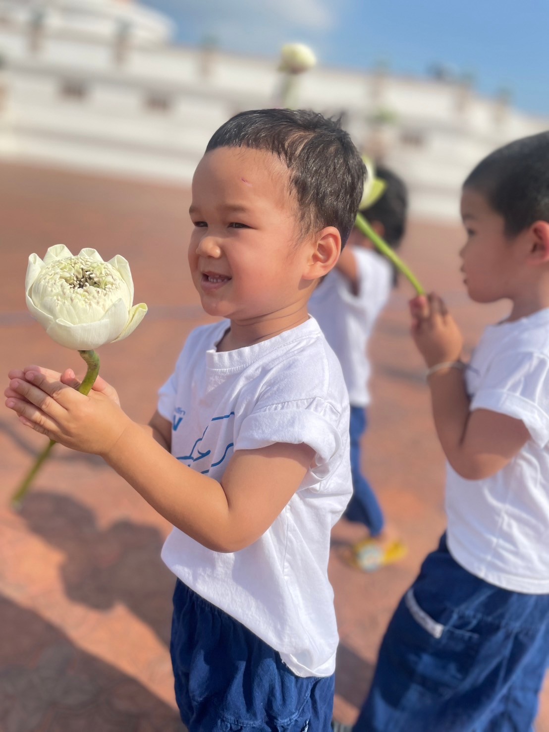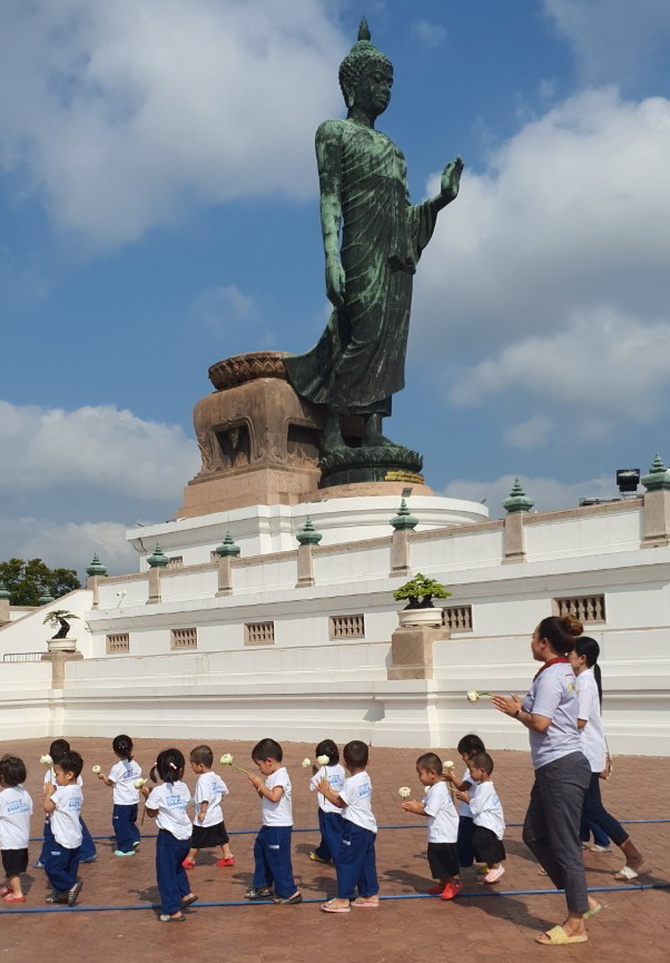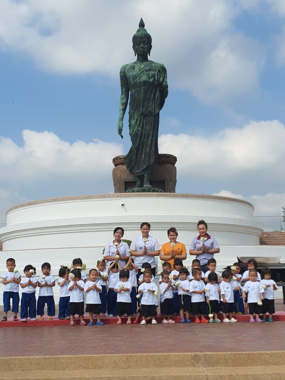 ครูบี และ ครูตูนย์ พร้อม ทีม จึงได้ร่วมกัน พาเด็ก ๆ จำนวน 27 คน ไปเวียนเทียนที่ " สวนพุทธมณฑล " โดย พี่บี แม่หญิง พี่ตูนย์ พี่แป้ง พี่หมวย ได้พาเด็กๆ ไหว้พระ สวนมนต์ และ เดินเวียนเทียนรอบ องค์พระศรีศากยะทศพลญาณ พระพุทธรูปปางลีลา ถึงแดดร้อนเพียงไหน แต่เด็กๆทุกคน ตั้งใจยกมือพนม ในมือมีดอกบัว และ บรรจงเดินเวียนเทียนอย่างตั้งใจ เมื่อเดินเวียนเทียนเสร็จ ก็ได้พาเด็กๆไปทำทาน โดย ให้อาหาร ปลา