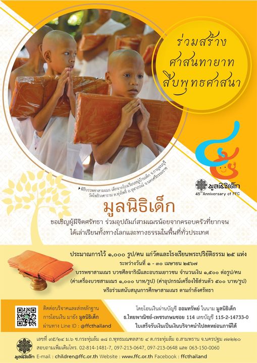 ผ่านบัญชี “มูลนิธิเด็ก” ธ.ไทยพาณิชย์ 115-2-14733-0 (ระบุในสลิป : บรรพชาสามเณร)