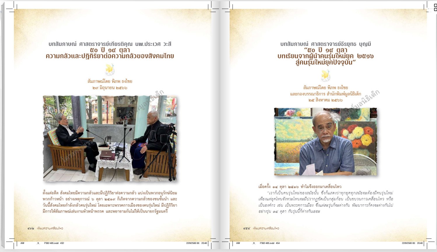 นอกจากนี้ยังมีบทสัมภาษณ์ นายอานันท์ ปันยารชุน ศ.นพ.ประเวศ วะสี อ.สุลักษณ์ ศิวรักษ์ ศ.ธีรยุทธ บุญมี ให้สัมภาษณ์พิเศษถึงจิตวิญญาณ ๑๔ ตุลา โดยมองไปถึงอนาคต โดยพิภพ ธงไชย เป็นผู้สัมภาษณ์ด้วยตนเอง
