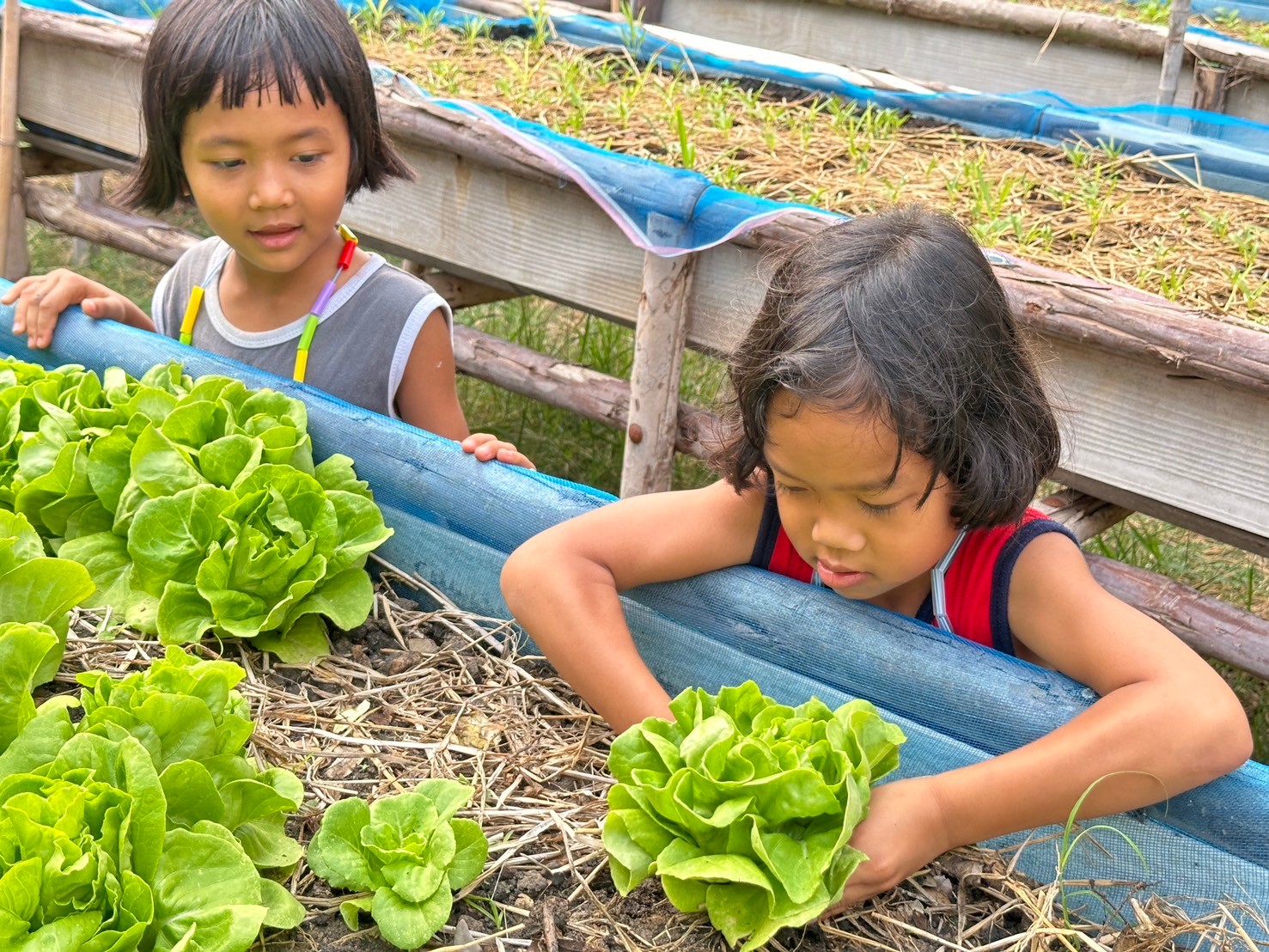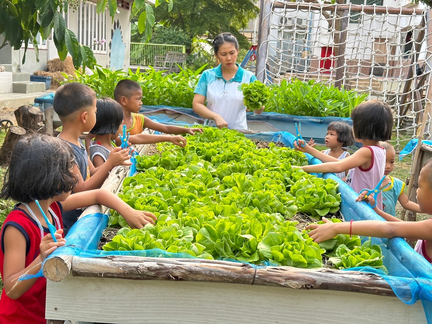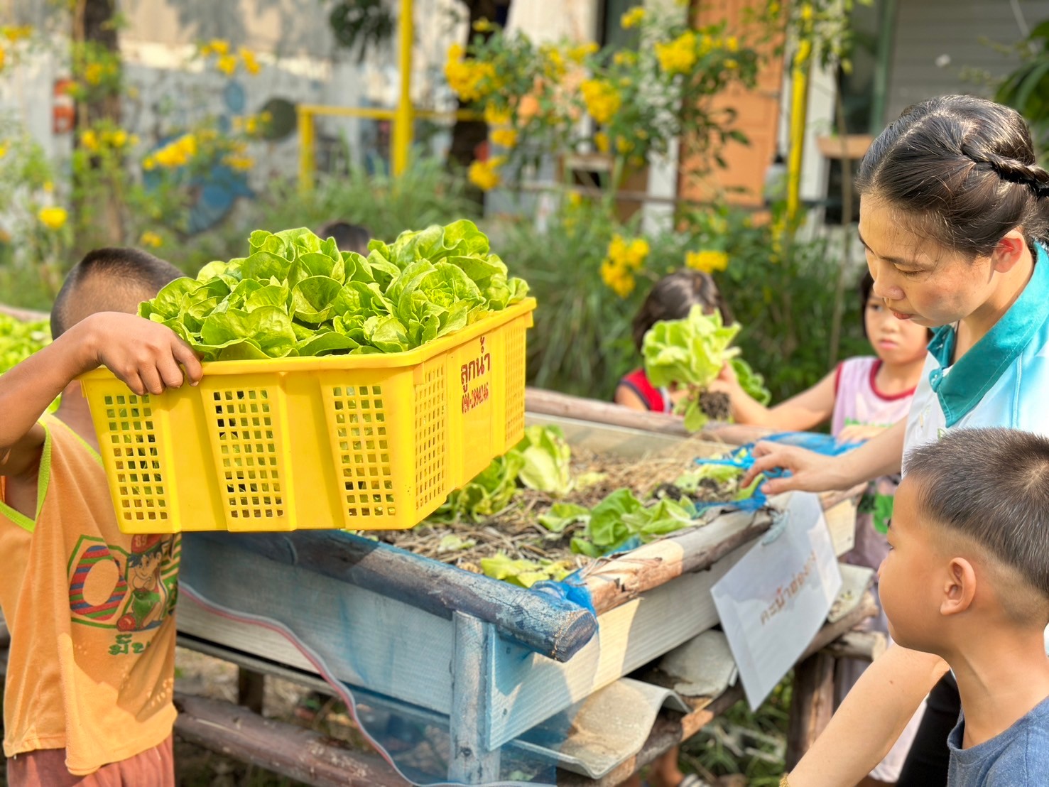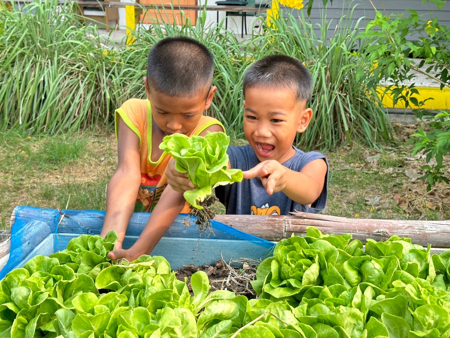 ถึงอากาศจะร้อนแค่ไหน เมื่อพ่อป้อม (ผอ.โรงเรียนอนุบาลหมู่บ้านเด็กสานรัก) แม่ยุ (แม่บ้านของโรงเรียน) ใส่ใจดูแลคอยรดน้ำสม่ำเสมอผักก็เติบโตพร้อมให้เก็บเกี่ยว แม่ปู คุณครูประจำชั้นเรียน ชวนเด็กๆ เก็บผักด้วยตัวเอง เพื่อนำมาทำอาหารในแต่ละมื้อ เด็กๆจะอยากกินผักที่ตัวเองปลูกผักจนสำเร็จและได้เก็บกับมือ เด็กๆ จะรู้สึกถึงการมีคุณค่าในตัวเอง