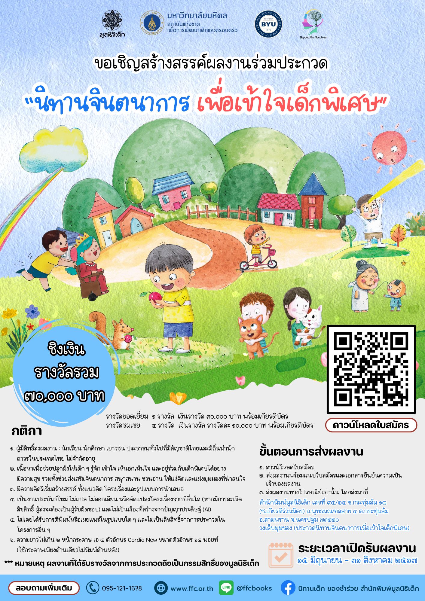 มูลนิธิเด็ก , สถาบันแห่งชาติเพื่อการพัฒนาเด็กและครอบครัว มหาวิทยาลัยมหิดล ร่วมกับ Brigham Young University และ Beyond the Spectrum ขอเชิญผู้สนใจ ส่งผลงานเข้าร่วมการประกวด โครงการ “ประกวดนิทานจินตนาการเพื่อเข้าใจเด็กพิเศษ” เพื่อค้นหานักเขียนนิทานรุ่นใหม่สร้างสรรค์นิทานและส่งต่อจินตนาการให้กับเด็ก ชิงเงินรางวัลมูลค่ารวม ๗๐,๐๐๐ บาท พร้อมเกียรติบัตร