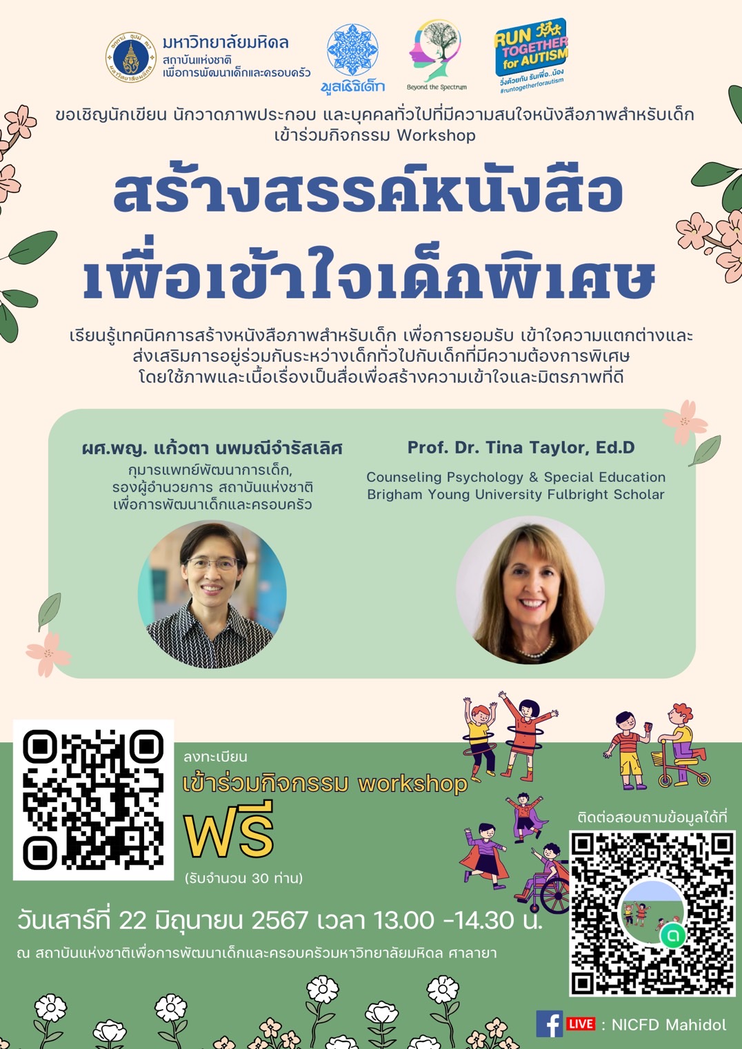 ขอเชิญผู้สนใจ นักเขียน นักวาดภาพประกอบ ที่สนใจเรียนรู้การทำหนังสือภาพสำหรับเด็ก จัดขึ้นเพื่อส่งเสริมการสร้างมิตรภาพและอยู่ร่วมกันระหว่างเด็กทั่วไปกับเด็กที่มีต้องการพิเศษ