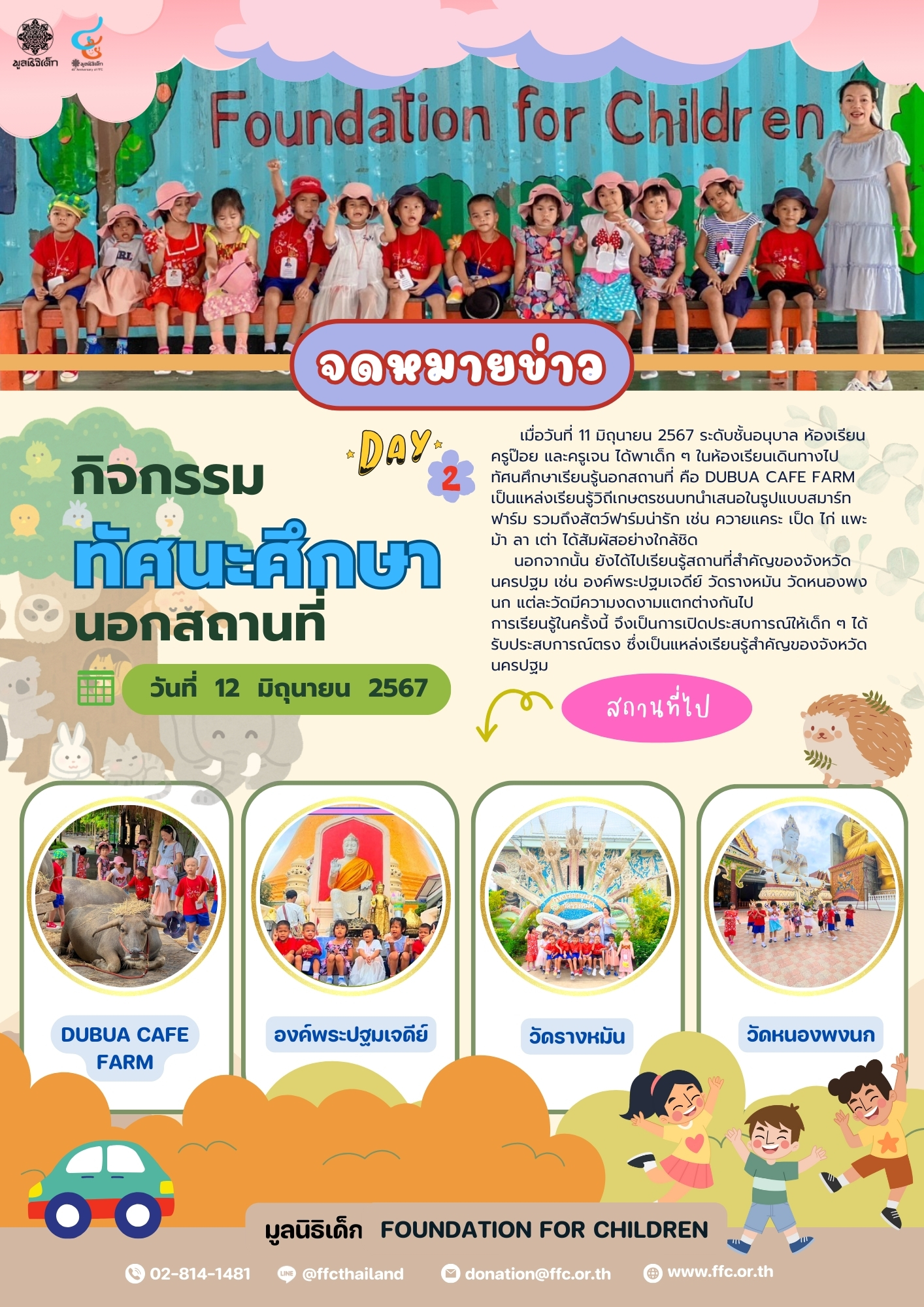 เมื่อวันที่ 11 มิถุนายน 2567 ระดับชั้นอนุบาล ห้องเรียนครูป๊อย และครูเจน ได้พาเด็ก ๆ ในห้องเรียนเดินทางไปทัศนศึกษาเรียนรู้นอกสถานที่ คือ Dubua cafe Farm เป็นแหล่งเรียนรู้วิถีเกษตรชนบทนำเสนอในรูปแบบสมาร์ทฟาร์ม รวมถึงสัตว์ฟาร์มน่ารัก เช่น ควายแคระ เป็ด ไก่ แพะ ม้า ลา เต่า ได้สัมผัสอย่างใกล้ชิด