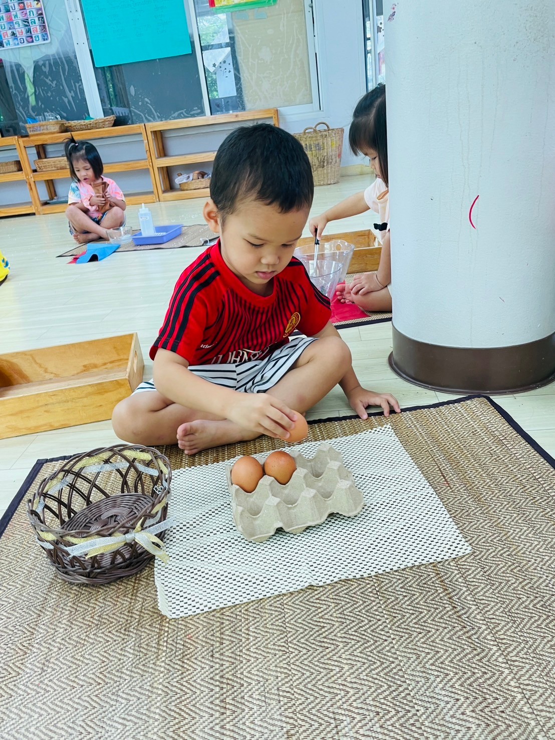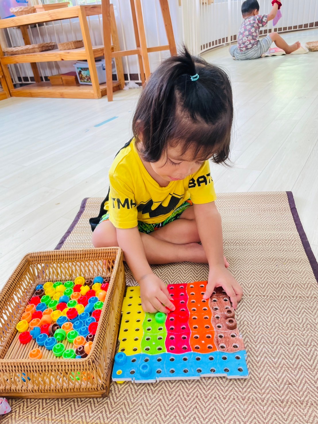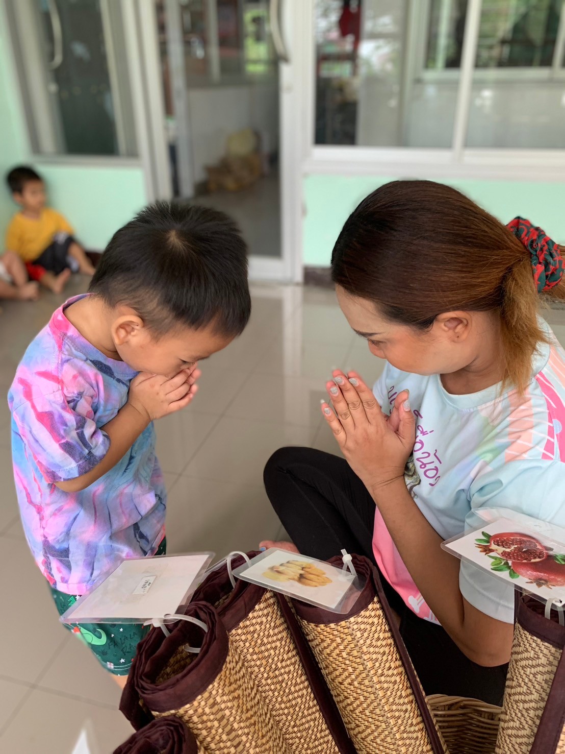 หลังจากนั้น ก่อนเริ่มทำอุปกรณ์ พี่ๆ และเด็ก จะมีการสวัสดี และ กอดกันก่อนเริ่มกิจกรรม เป็นการทักทาย และ มอบความรักให้กัน เมื่อเสร็จแล้ว พี่ ๆ ที่ดูแล จะให้เด็ก ๆ ไปเลือก อุปกรณ์ที่ ตนเองอยากทำ มาทำในเสื่อของตัวเองที่ปูไว้ก่อนหน้า เมื่อทำอุปกรณ์ชิ้นแรกเสร็จ เด็กน้อย ก็สามารถ นำชิ้นแรกไปเก็บ และ หยิบชิ้นอื่นมาทำต่อได้ เด็ก ๆ จะ หยิบอุปกรณ์ มาทำจน พอใจแล้ว ก็จะกลับมาเก็บเสื่อ ของตนเองเข้าที่ และ ไปนั่ง อ่านหนังสื่อ นิทาน หรือ นั่งเล่น รอเพื่อน ๆ ทำเสร็จ โดยจะไม่ส่งเสียงดัง รบกวนเพื่อน เป็นกฎกติกา ที่ได้ตกลงกัน และ เด็ก ก็เรียนรู้ ในการทำตามกฎกติกา อย่างดี และนี้ คือห้องเรียนของเด็ก บ้านทานตะวัน ค่ะ