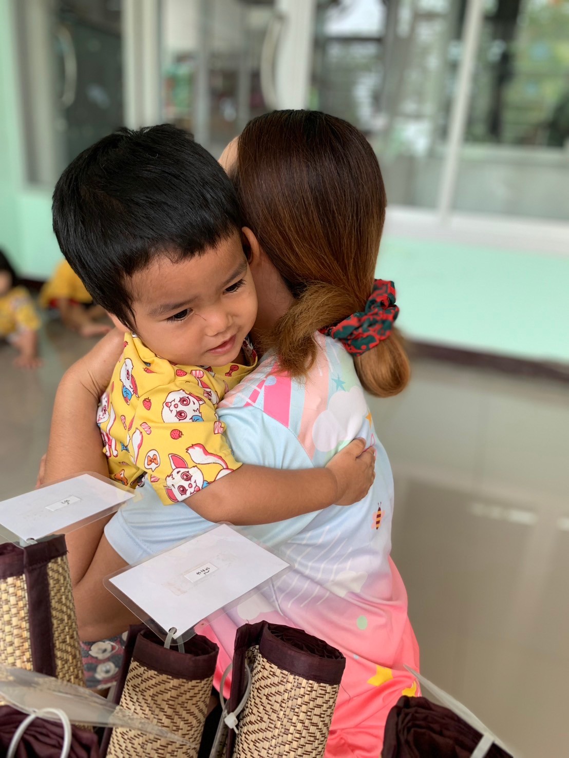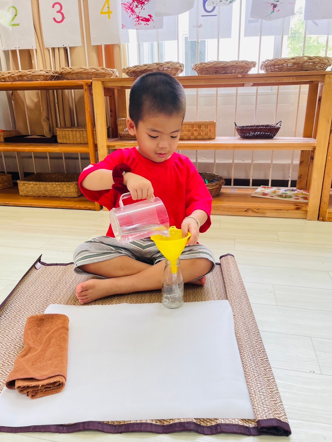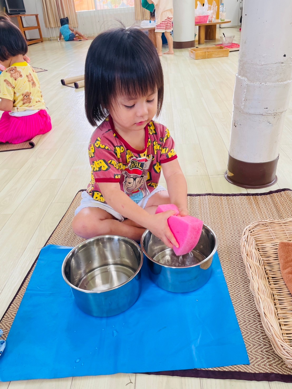 หลังจากนั้น ก่อนเริ่มทำอุปกรณ์ พี่ๆ และเด็ก จะมีการสวัสดี และ กอดกันก่อนเริ่มกิจกรรม เป็นการทักทาย และ มอบความรักให้กัน เมื่อเสร็จแล้ว พี่ ๆ ที่ดูแล จะให้เด็ก ๆ ไปเลือก อุปกรณ์ที่ ตนเองอยากทำ มาทำในเสื่อของตัวเองที่ปูไว้ก่อนหน้า เมื่อทำอุปกรณ์ชิ้นแรกเสร็จ เด็กน้อย ก็สามารถ นำชิ้นแรกไปเก็บ และ หยิบชิ้นอื่นมาทำต่อได้ เด็ก ๆ จะ หยิบอุปกรณ์ มาทำจน พอใจแล้ว ก็จะกลับมาเก็บเสื่อ ของตนเองเข้าที่ และ ไปนั่ง อ่านหนังสื่อ นิทาน หรือ นั่งเล่น รอเพื่อน ๆ ทำเสร็จ โดยจะไม่ส่งเสียงดัง รบกวนเพื่อน เป็นกฎกติกา ที่ได้ตกลงกัน และ เด็ก ก็เรียนรู้ ในการทำตามกฎกติกา อย่างดี และนี้ คือห้องเรียนของเด็ก บ้านทานตะวัน ค่ะ