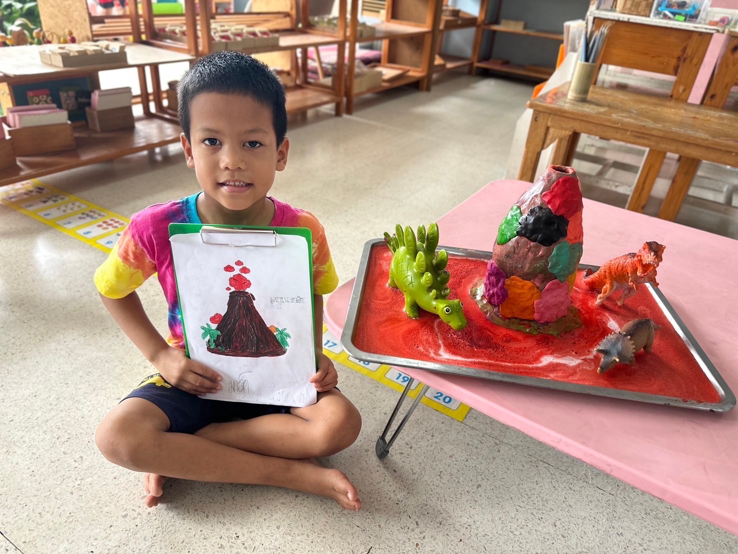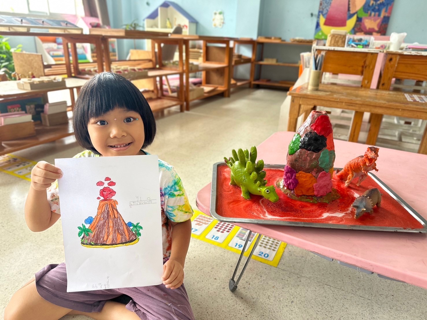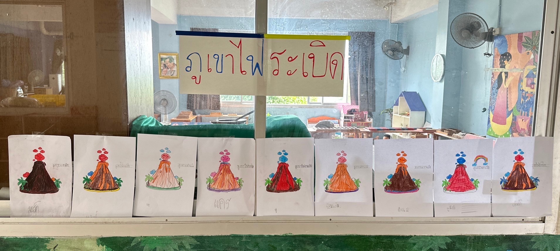 ก่อนการทดลองให้เด็กๆ ได้ระบายสีภูเขาไฟระเบิดตามจินตนาการกันก่อน