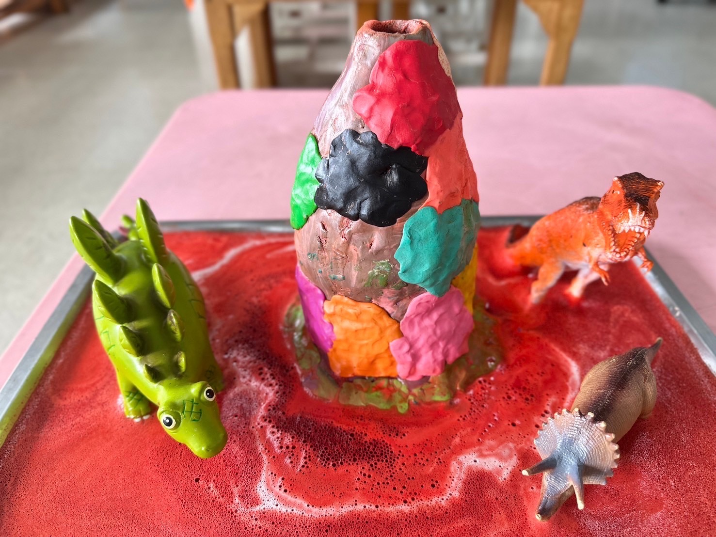 ขั้นตอนที่ 1 : การทำภูเขาไฟ เราจะนำขวดน้ำดื่มที่เตรียมไว้มาทำเป็นปล่องภูเขาไฟแล้วใช้ดินน้ำมันมาก่อให้เป็นรูปภูเขาไฟ ขั้นตอนนี้ให้เด็กๆช่วยกันได้เลยค่ะ เราควรวางภูเขาไฟของเราลงบนถาดนะคะเพื่อป้องกันการเลอะเทอะขณะที่ภูเขาไฟของเราระเบิดออกมาค่ะ จากนั้นตกแต่งบริเวณโดยรอบให้สวยงามสมจริง เช่น มีต้นไม้ หรือมีไดโนเสาร์ ด้วยก็ได้ค่ะ