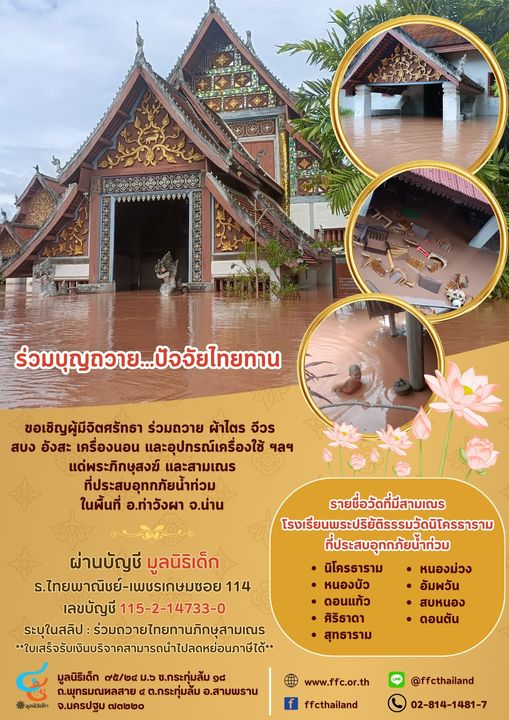 มูลนิธิเด็ก จึงขอเชิญผู้ที่มีจิตศรัทธา ร่วมบริจาคทำบุญถวาย ผ้าไตรจีวร สบง อังสะ เครื่องนอน และอุปกรณ์เครื่องใช้ ฯลฯ ในวัดที่ประสบอุทกภัย เพื่อถวายปัจจัยไทยทานแด่พระภิกษุสามเณร และฟื้นฟูซ่อมแซมวัด หลังเหตุการณ์น้ำท่วมผ่านพ้น
