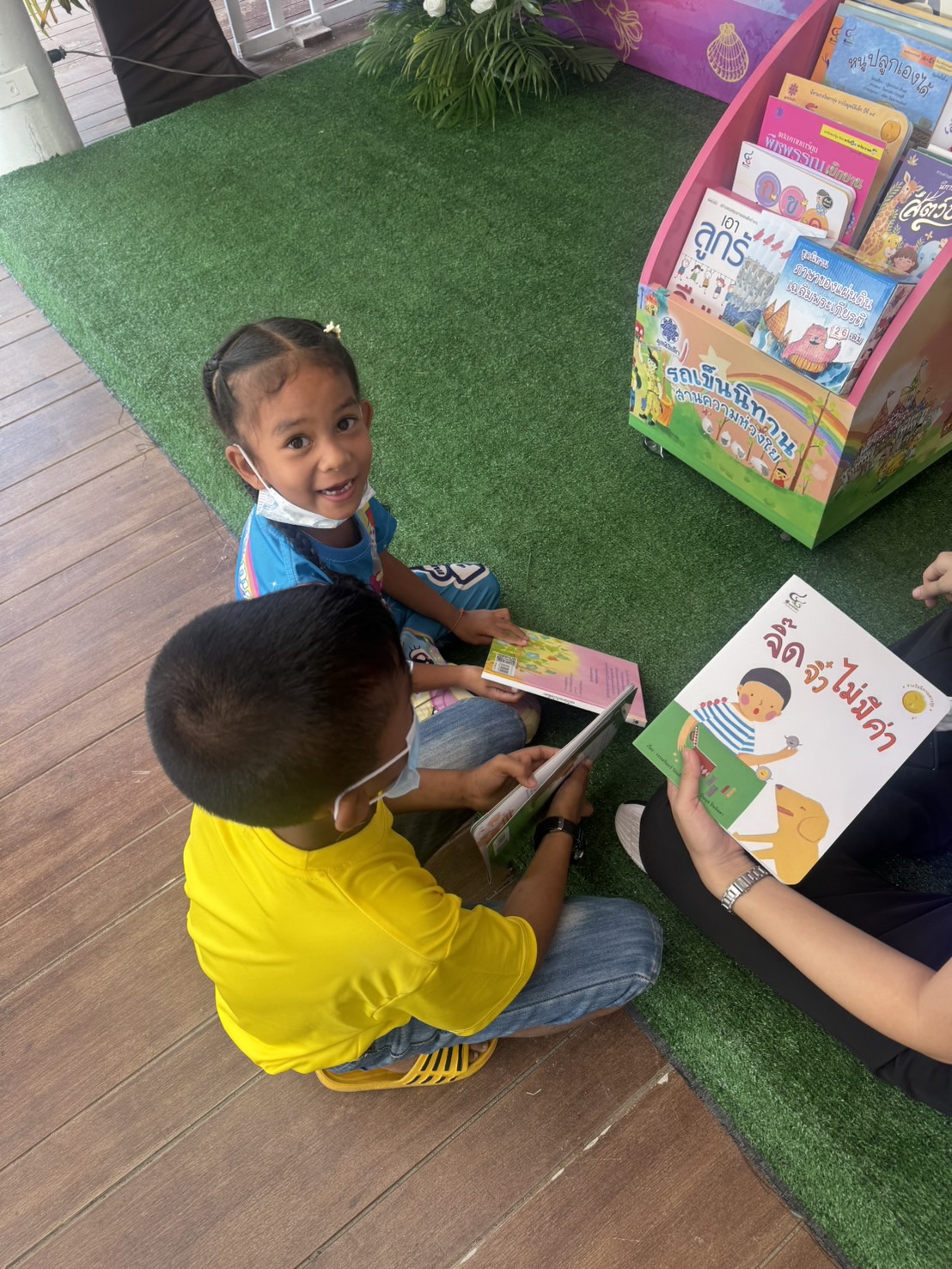 เด็กๆ กำลังอ่านนิทานในรถเข็นนิทาน ระหว่างรอพบคุณหมอที่หน้าห้องTele-consult