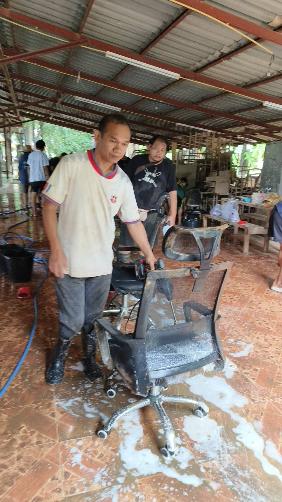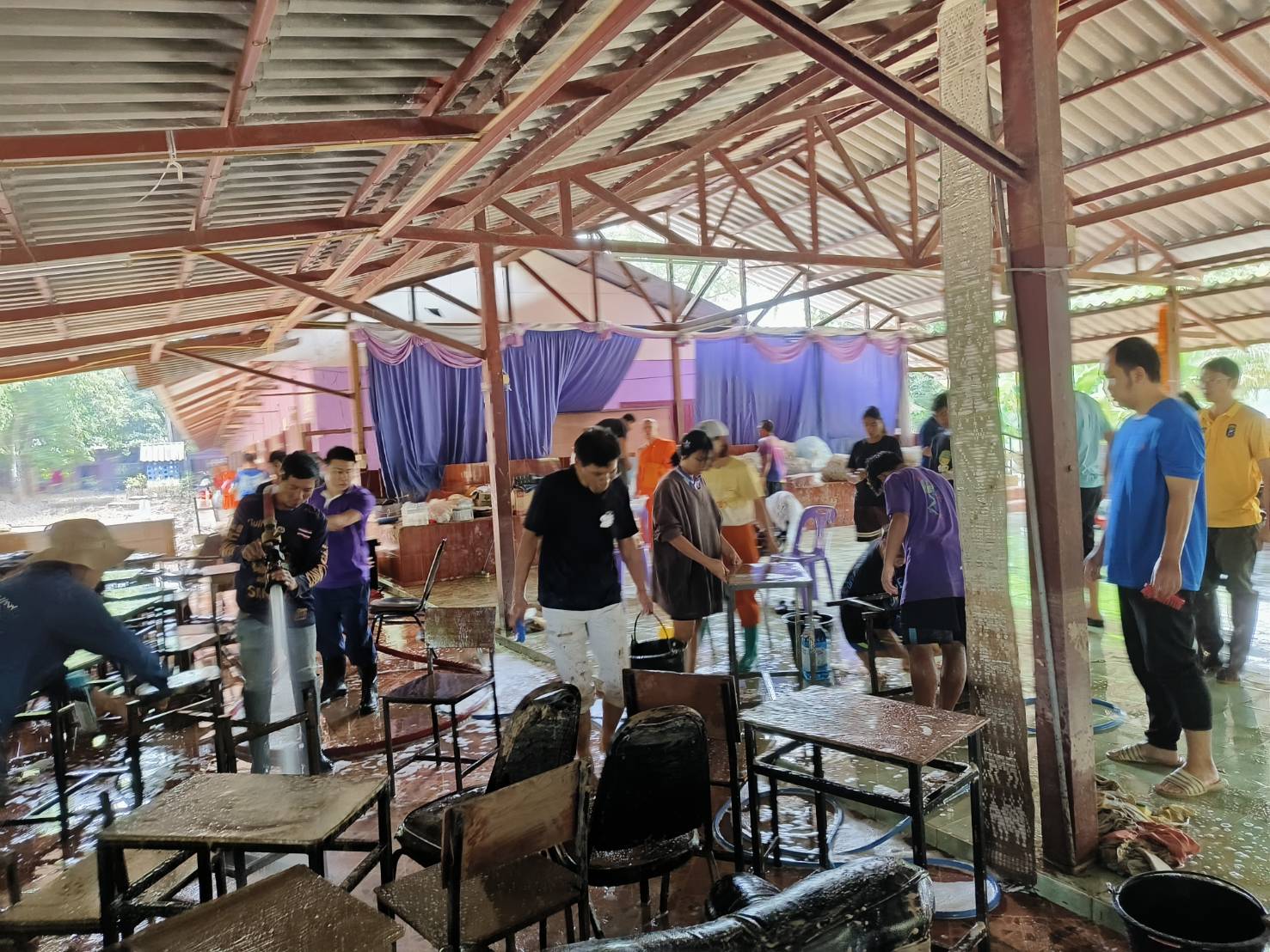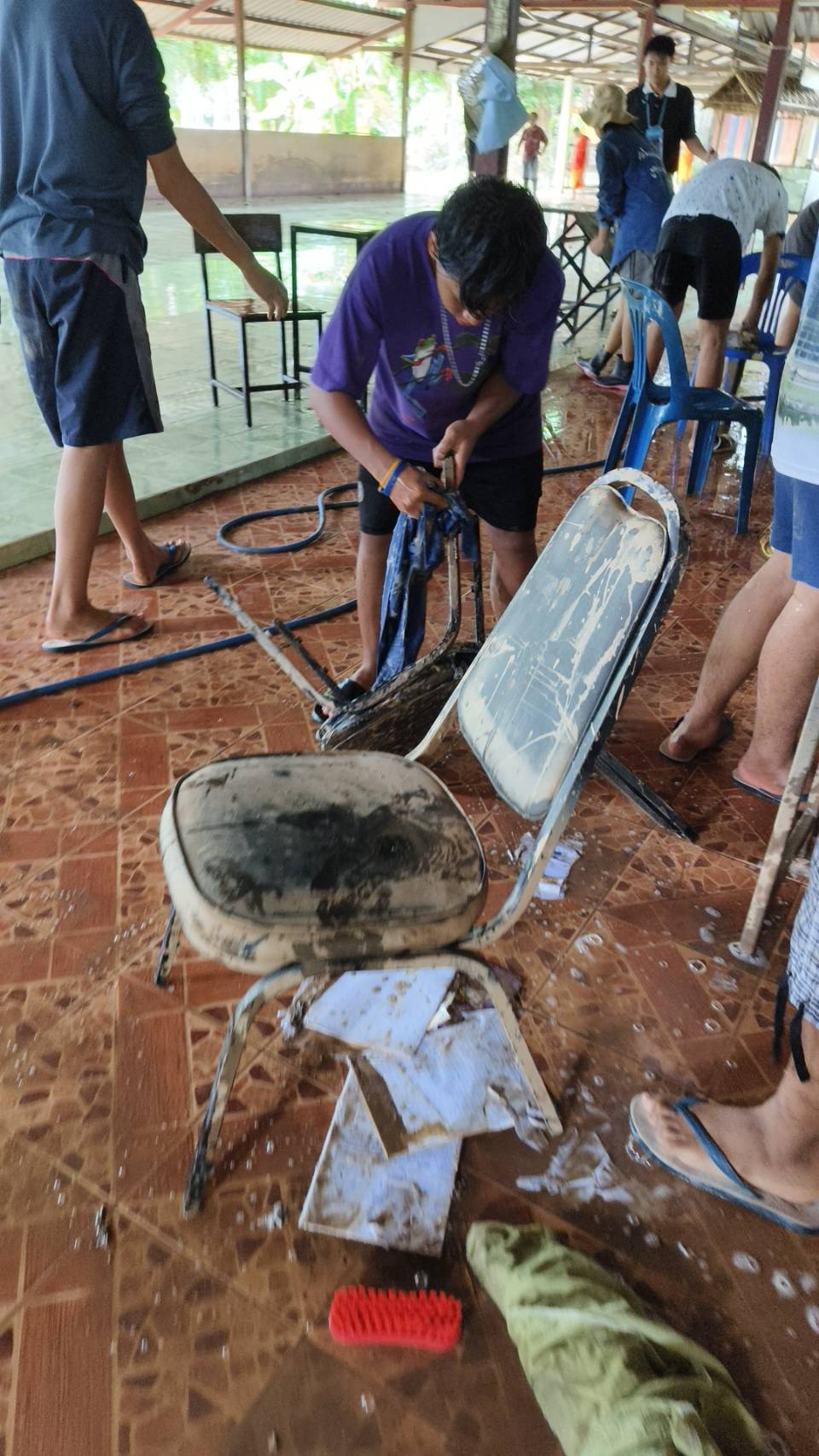 หลังน้ำได้พัดพาไป ยังคงเหลือไว้ซึ่งดินโคลนหนา ข้าวของเปื้อนโคลนจำนวนมาก ที่ต้องได้รับการทำความสะอาด งานแรกที่ทีมมูลนิธิเด็กทำได้ก็คือการล้างเก้าอี้ เนื่องจากพื้นที่บริเวณวัดทั้งหมดมีโคลนหนา ยากต่อการเข้าถึงหรือการที่จะทำความสะอาด