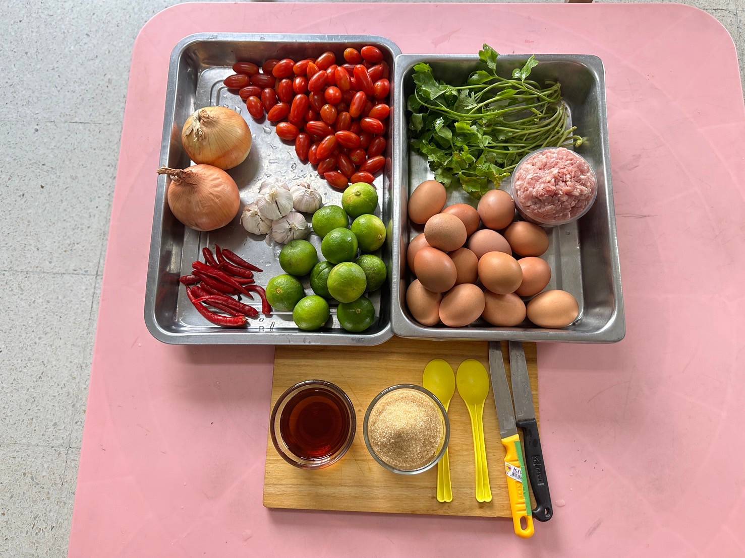 ไข่ไก่ คื่นฉ่าย หอมหัวใหญ่ มะนาว พริกขี้หนู กระเทียม หมูสับ น้ำตาลทราย น้ำปลา