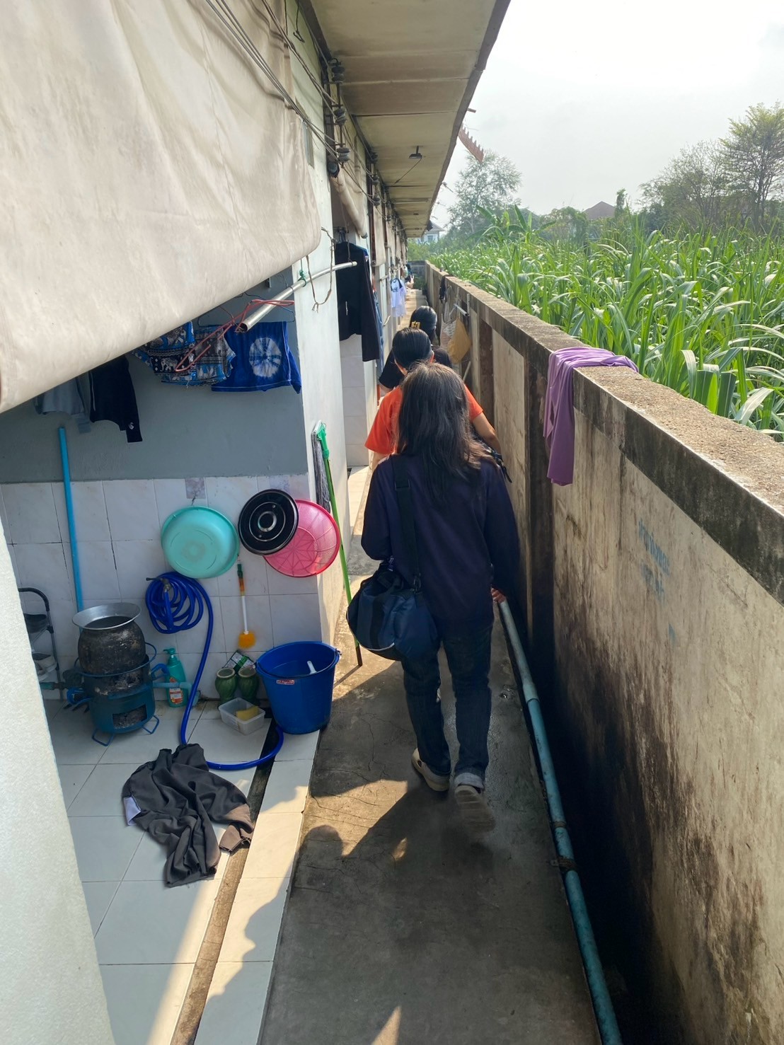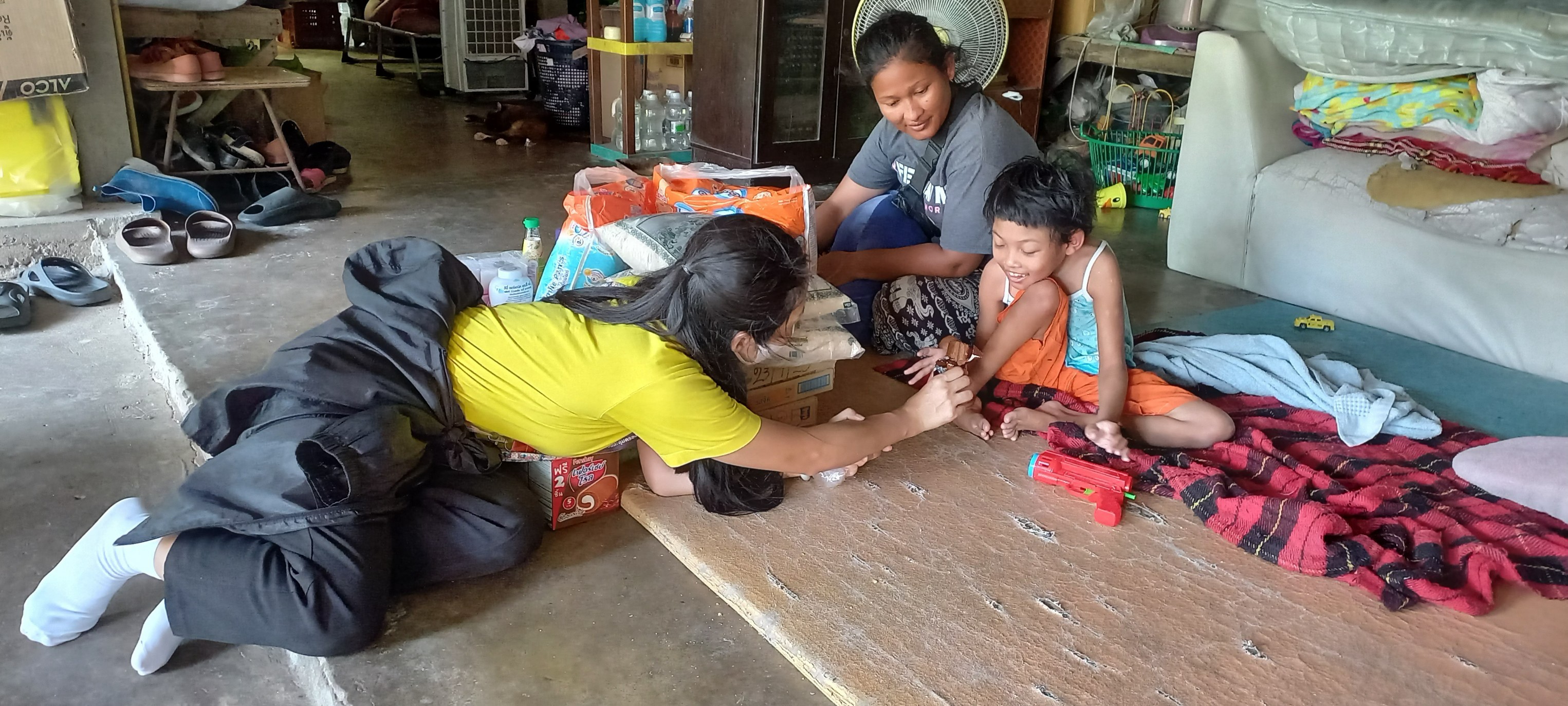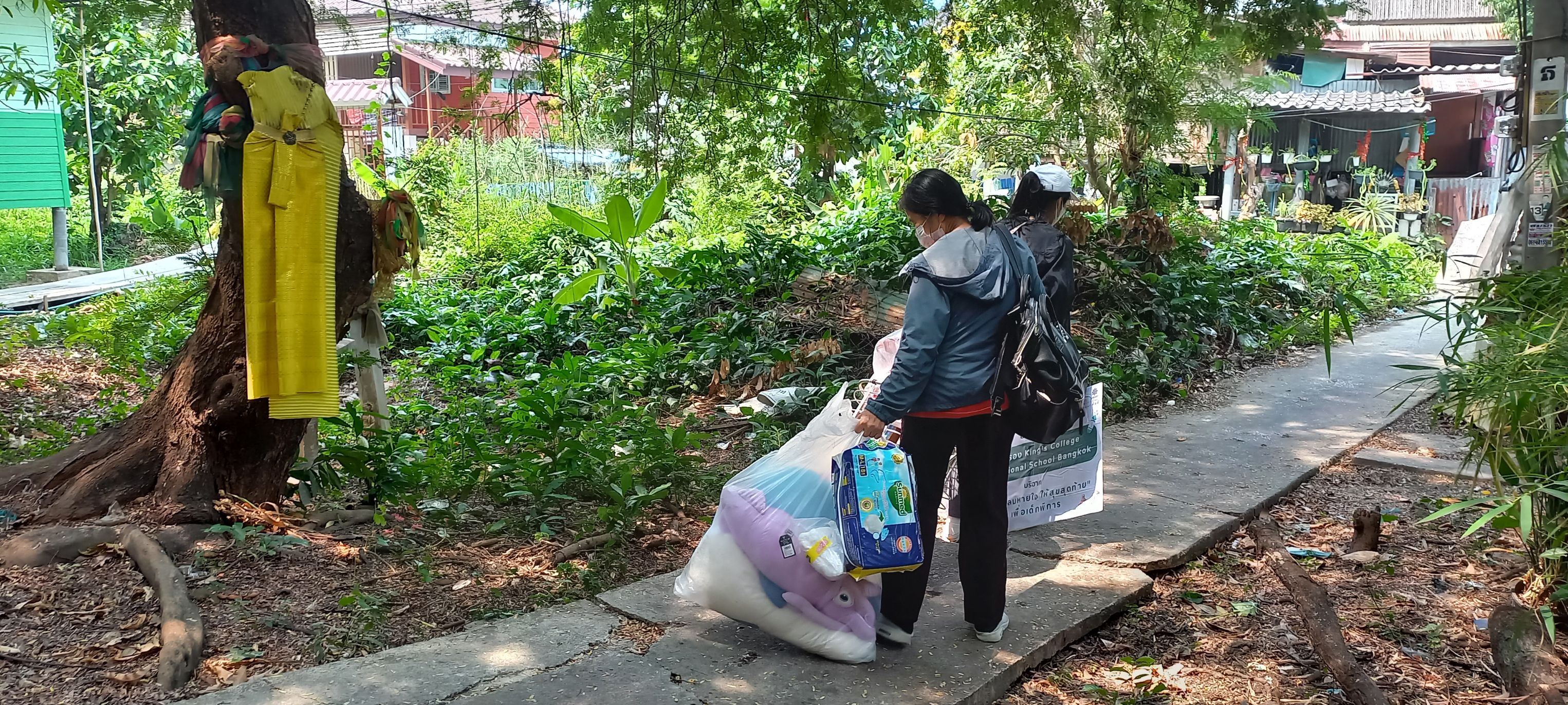 ทีมพัฒนาครอบครับคิดดีเยี่ยมบ้าน ตระเวนมอบถุงต่อลมหายใจเพื่อสุขสุดท้ายให้เด็กพิการที่รออยู่ ขอบอกว่าทีมเราเป็นผู้หญิง 3 คนพร้อมลุยไปถึงไหนถึงกัน บ้านเด็กๆ อยู่ที่ไหน เราไม่เคยบ่น พร้อมแบก ยก หอบสิ่งของไปให้ถึงมือของเด็ก ๆ ที่รอความช่วยเหลือจากผู้ใหญ่ใจดี หลบร้อนในวินรถมอเตอร์ไซด์รับจ้าง เดินข้ามทางรถไฟ เดินเลาะริมคลองแบกของหลบกับระเบิดที่น้องหมาวางไว้ (ถ้าใครเผลอพลาดเหยียบเข้า ความเหม็นจะติดเท้าไปทั้งวัน) ผ่านเข้าหน้าวัดออกหลังวัดทะลุสวนเข้าชุมชน แคมป์คนงานก่อสร้าง เผชิญหน้ากับฝูงหมา ฝูงห่านเจ้าถิ่น