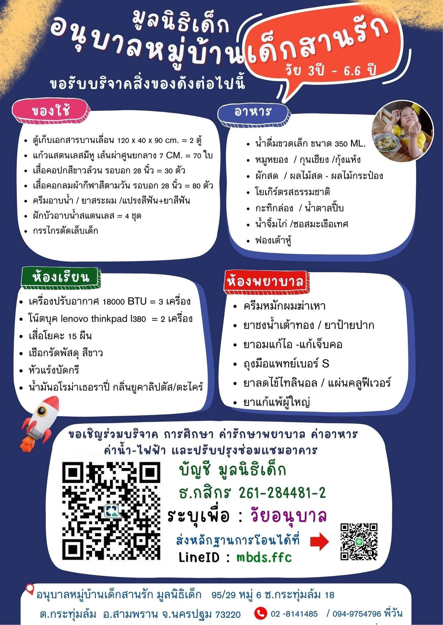 2. โครงการโรงเรียนอนุบาลหมู่บ้านเด็กสานรัก (เด็กอายุ 3 – 6 ปี) เด็กประมาณ 60 คน อยู่พุทธมณฑลสาย 4