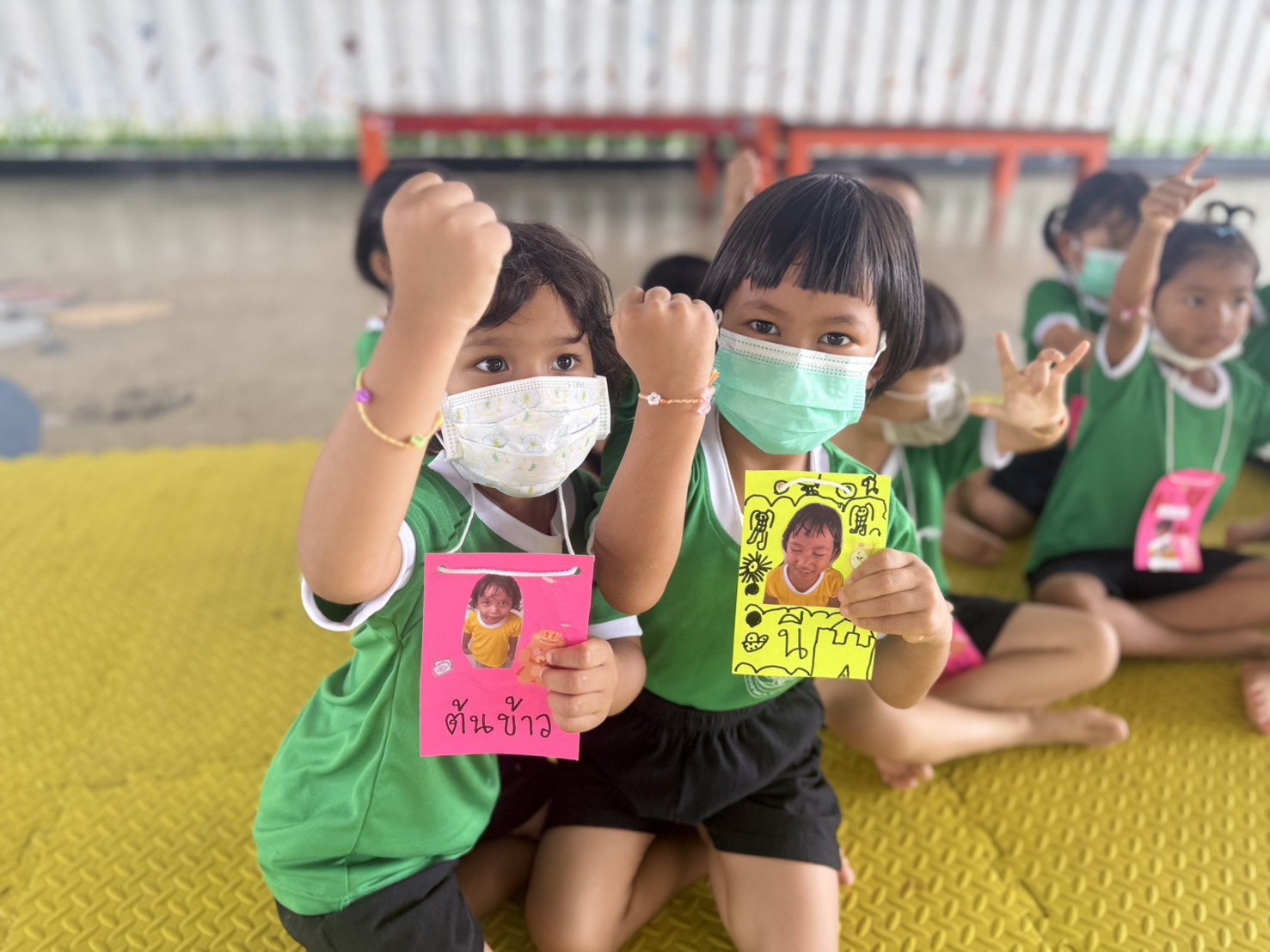 2. กิจกรรมตกแต่งป้ายชื่อห้อยคอ คุณครูเขียนชื่อของเด็กแต่ละคนลงบนป้ายชื่อแบบห้อยคอ และเปิดโอกาสให้เด็กได้ตกแต่งป้ายของตนเองด้วยวัสดุศิลปะต่าง ๆ เช่น สีไม้ กระดาษสี และสติกเกอร์ เด็ก ๆ ได้แสดงความคิดสร้างสรรค์และรู้สึกภาคภูมิใจในผลงานของตนเอง ครูช่วยร้อยสายคล้องคอให้เด็กสวมใส่ระหว่างทำกิจกรรม เพื่อเป็นสื่อกลางในการจดจำชื่อและเสริมความมั่นใจ