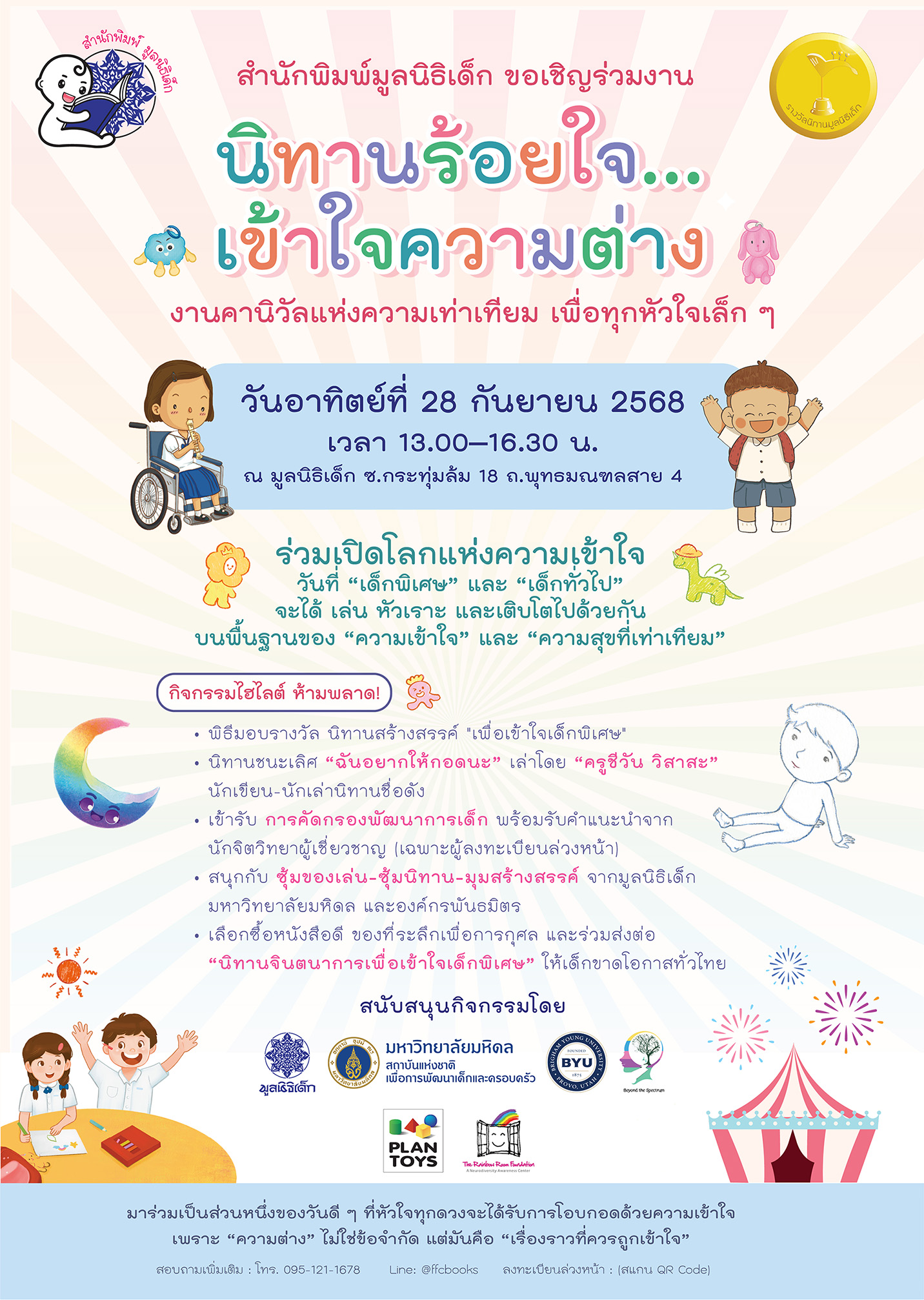 สำนักพิมพ์มูลนิธิเด็ก ขอเชิญร่วมงาน “นิทานร้อยใจ…เข้าใจความต่าง” งานคาร์นิวัลแห่งความเท่าเทียม เพื่อทุกหัวใจเล็ก ๆ วันอาทิตย์ที่ 28 กันยายน 2568 เวลา 13.00 – 16.30 น. ณ มูลนิธิเด็ก พุทธมณฑลสาย 4