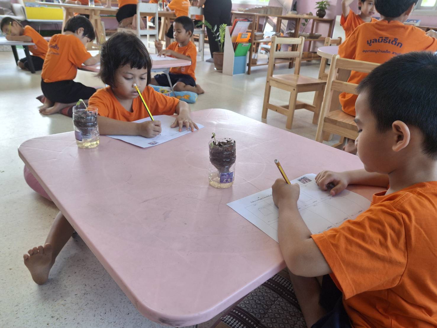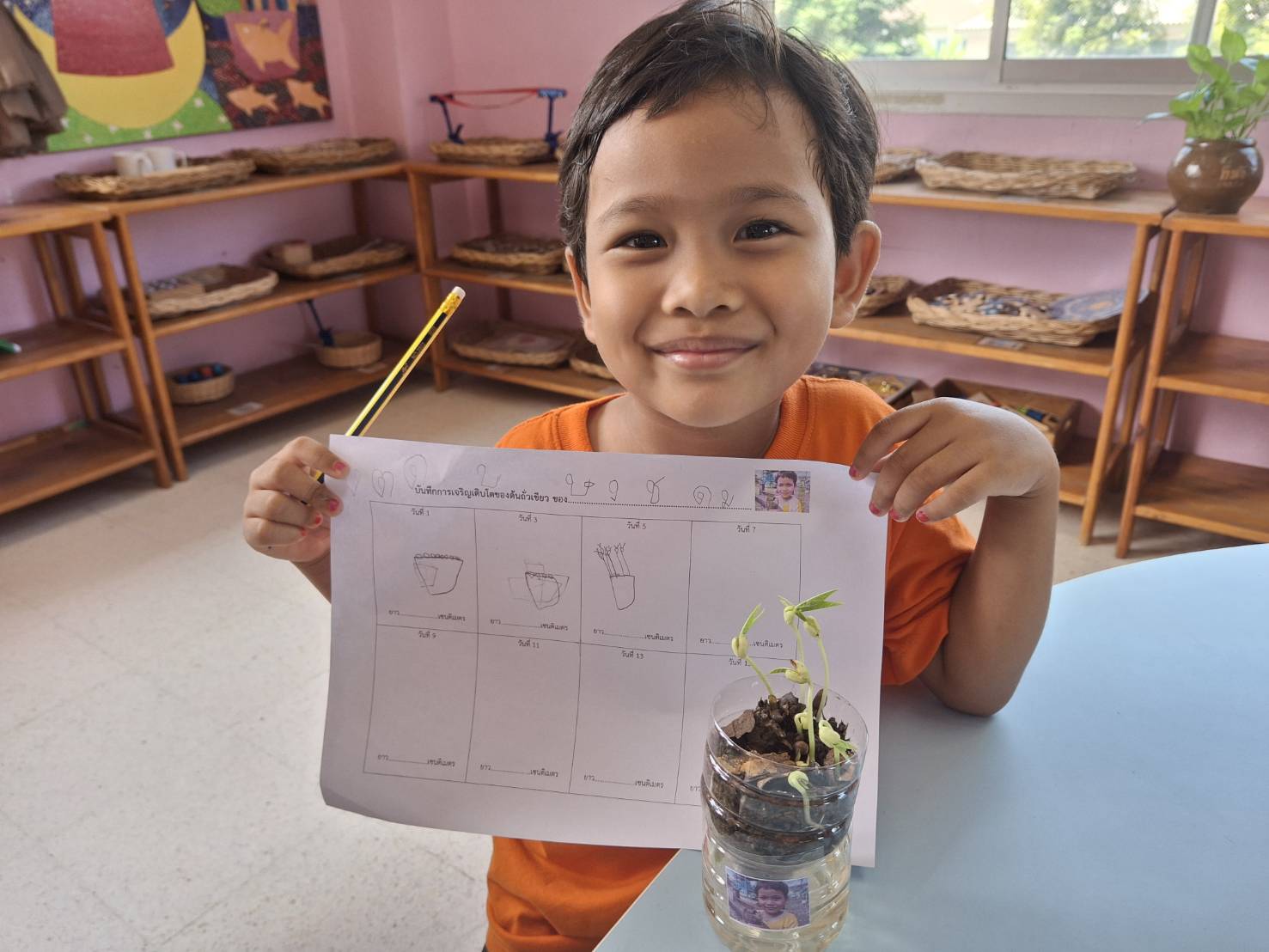 เด็ก ๆ ได้ฝึกการดูแลต้นถั่วของตนเองอย่างสม่ำเสมอ เช่น การรดน้ำ การวางไว้ในที่มีแสงแดด และการจดบันทึกการเปลี่ยนแปลงที่เกิดขึ้นในแต่ละช่วง ตั้งแต่เมล็ดเริ่มงอก จนกระทั่งต้นอ่อนเจริญเติบโตขึ้นเป็นต้นถั่วเล็ก ๆ พร้อมใบสีเขียวสดใส