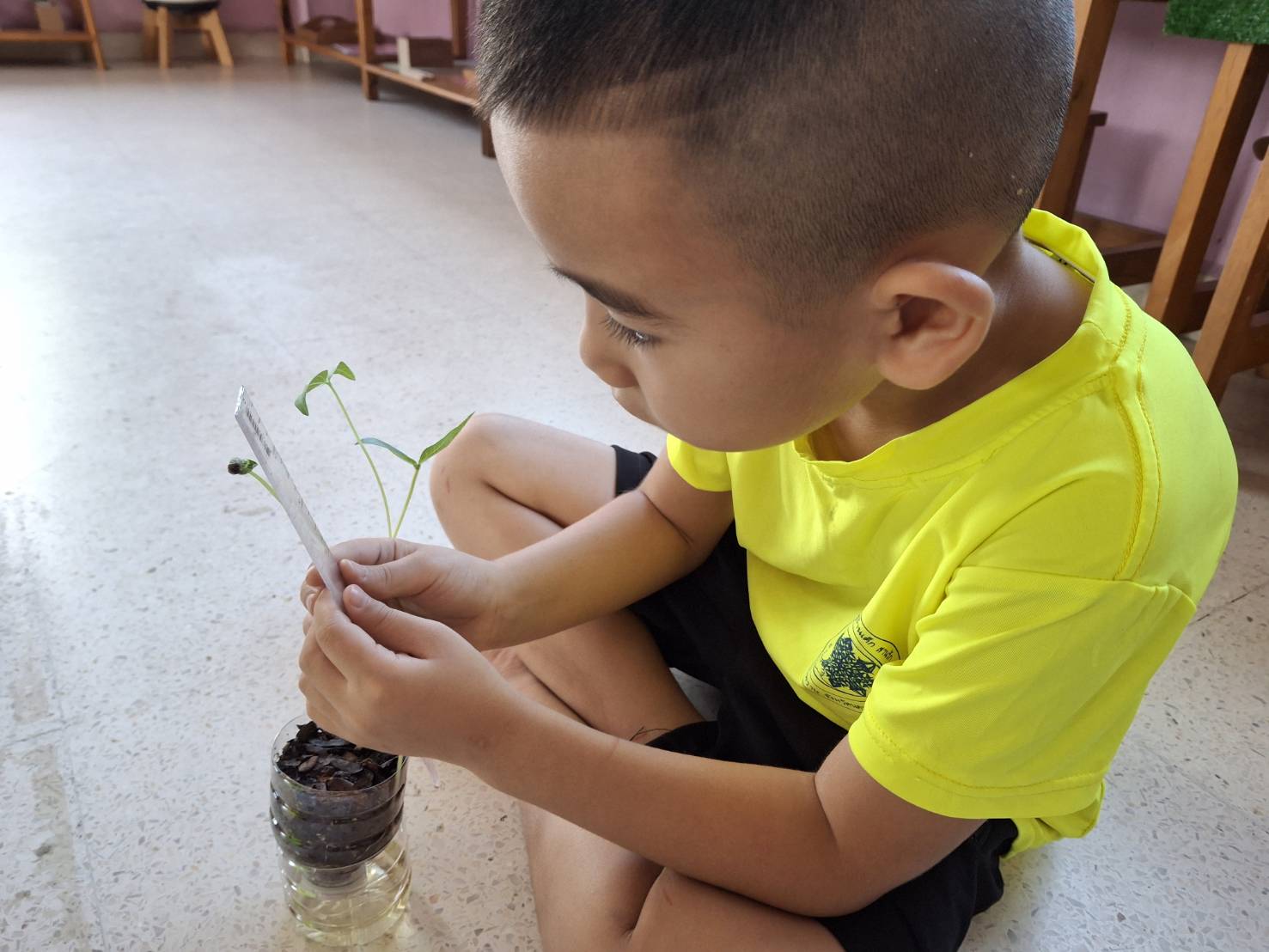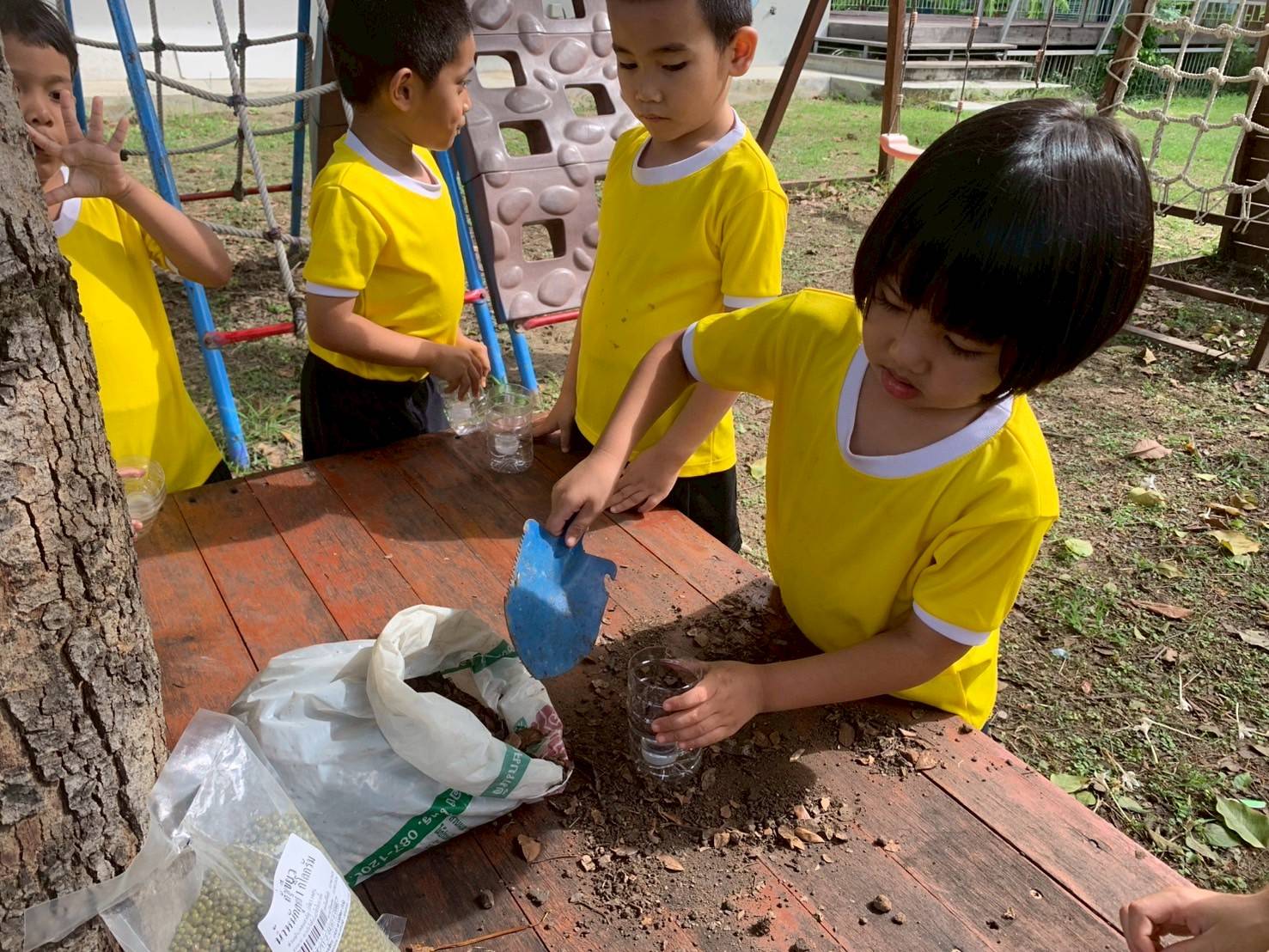 เป็นกิจกรรมในกลุ่มสาระวิทยาศาสตร์ที่เปิดโอกาสให้เด็ก ๆ ได้เรียนรู้จากการลงมือปฏิบัติจริง โดยเริ่มจากการนำเมล็ดถั่วเขียวมาเพาะลงในขวดพลาสติกใสที่เด็ก ๆ ช่วยกันเตรียมเอง แล้วคอยสังเกตการเจริญเติบโตของถั่วในแต่ละวัน