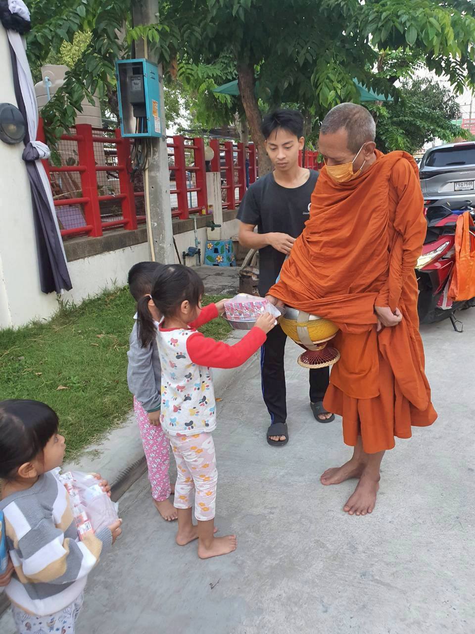 หกโมงเช้า พี่เลี้ยงและเด็กๆ เตรียมอาหารออกมารอเพื่อใส่บาตรหลวงพ่อ
