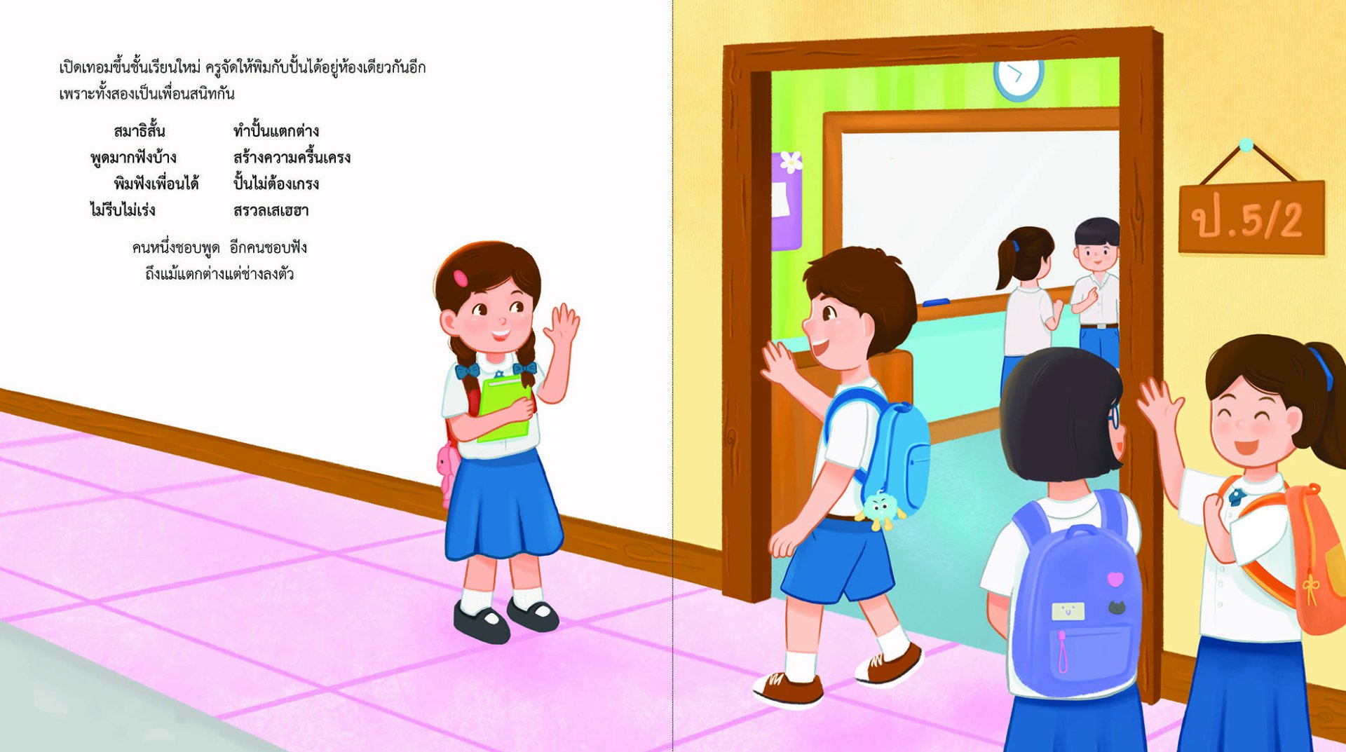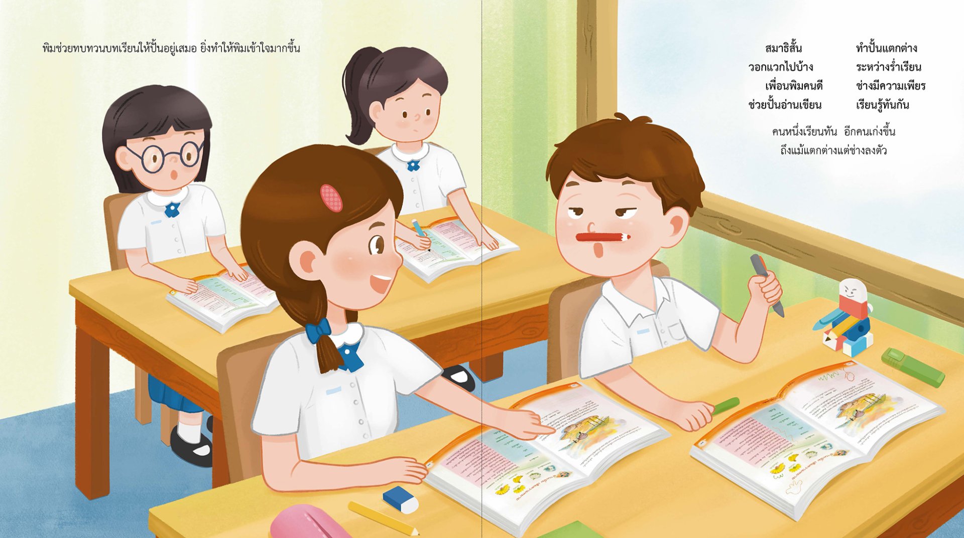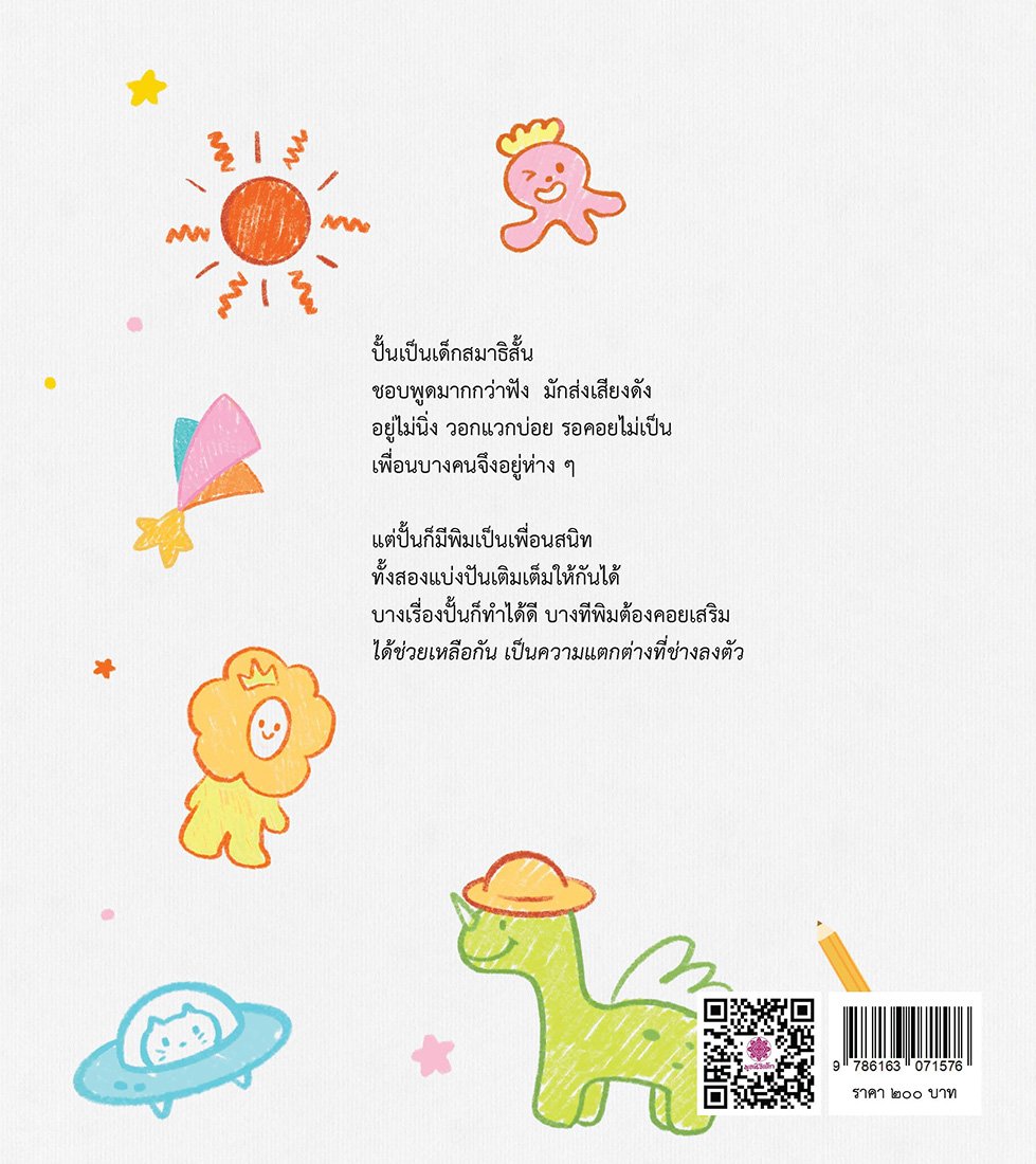 พิมกับปั้น เพื่อนรักที่แตกต่าง นิทานภาพสำหรับเด็กเล่าเรื่องมิตรภาพของ “พิม” และ “ปั้น” เด็กสองคนที่มีนิสัยต่างกันอย่างชัดเจน พิมเป็นเด็กใจเย็น ขยัน ตั้งใจเรียน ส่วนปั้นมีสมาธิสั้น ขี้ลืม ซุกซน และคิดนอกกรอบอยู่เสมอ