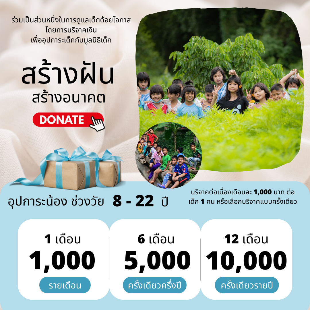 ขอเชิญชวนผู้บริจาคทุกท่านสร้างสังคมแห่งการแบ่งปัน ด้วยการเลี้ยงอาหารให้กับเด็ก ๆ ด้อยโอกาส ตามโครงการต่าง ๆ ของมูลนิธิเด็ก อาหารทุกจาน ทุกมื้อ ที่ท่านได้แบ่งปันให้กับเด็ก ๆ กลุ่มนี้ พวกเขาจะได้รับสารอาหารที่มีคุณค่า ถูกต้องตามหลักโภชนาการ อันเป็นประโยชน์ต่อพัฒนาการทางร่างกาย อารมณ์ จิตใจ และสมอง เพื่อให้พวกเขาได้เติบโตอย่างสมบูรณ์ แข็งแรง และเปี่ยมไปด้วยรอยยิ้มแห่งความสุข